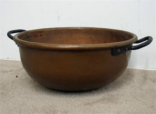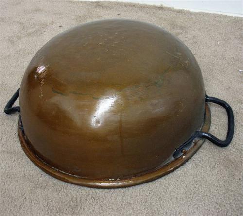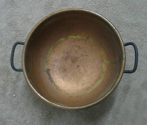 Copper candy kettle; iron baille handles; C.1900; 8" high x 17" diameter (some denting from use)