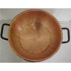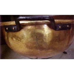 Copper candy kettle on stand, copper candy kettle with a pair of iron bail handles, on three legged wrought iron stand, 22 1/2" high x 19" diameter Estimate 100/250