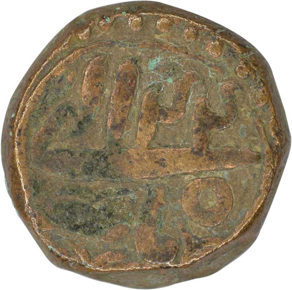 Akbar, Jalal-ud-din Muhammad, Chaharam Hissa Type, Minless Issue, Copper 1/2 Dam (Nisfi), RY 44, 'Tir' month, Obv. “tanka akbar shahi” at the top and “chaharam hissa” at the bottom, Rev:ilahi year at top 44 and the month of issue ‘tir’ at the bottom,10.45g, 18.84mm,probably Unlisted variety,about extremely fine, Very Rare.