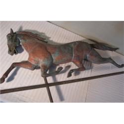 Copper Horse weather vane with mounting post; horse is 38-1/2" long x 16-1/2"h, age undetermined, not new.
