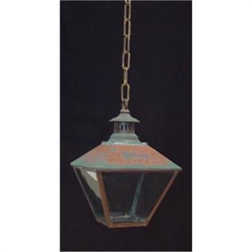 CIRCA 1920 FOUR SIDED COPPER LANTERN IN ORIGINAL WERDIGRIS PATINA.FOR EXTERIOR OR INTERIOR USE.</em></td>
