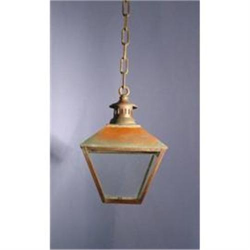</font></strong>Circa 1910 a copper four sided lantern in original verdigris patina glazed with clear glass panels,drop 28" lantern height 13 1/2" width 9 1/4".Drop can be modificated .</font>