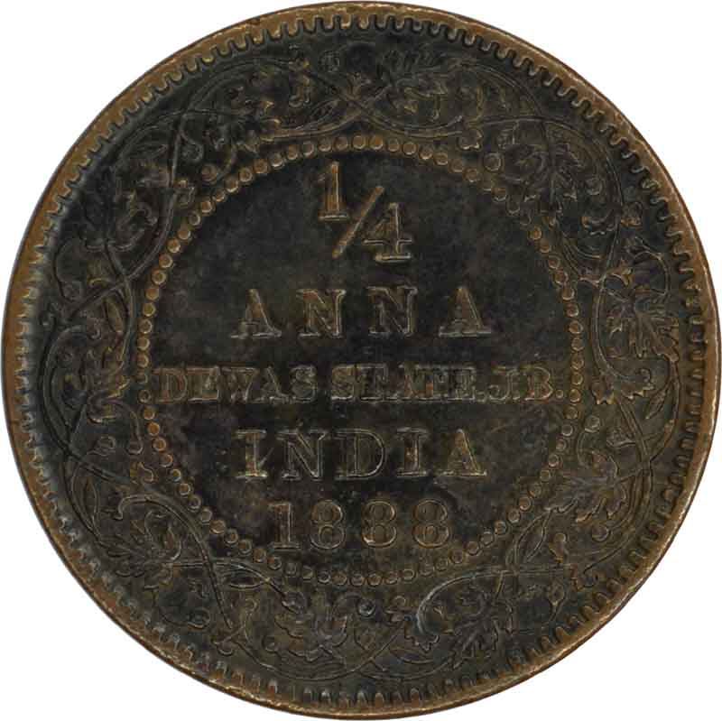 Dewas, Narayan Rao, Copper 1/4 Anna, with the name of Victoria Empress, VS 1888, Obv: crowned bust to left, Rev: value, date within beaded circle, 6.4g, 25.27mm, (KM# 3), about very fine, Scarce.