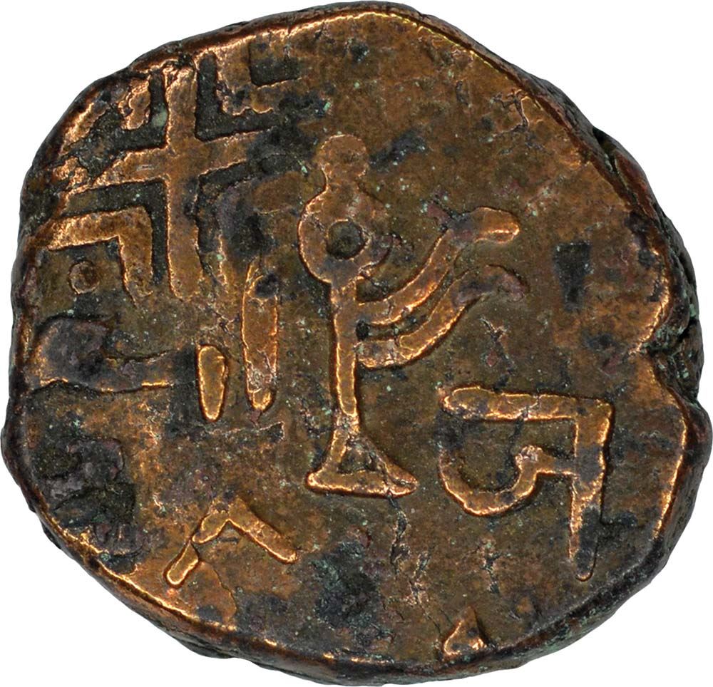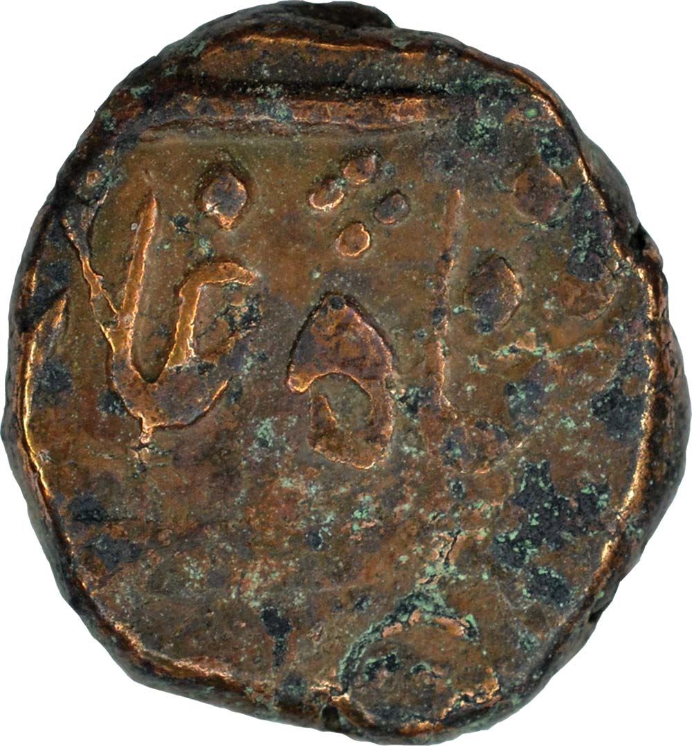 Baroda, Sayaji Rao II,Copper Paisa, Double Struck Error on bothin the name of shah alam II, Obv:shah alam II, Rev:nagari “Saa” “Ja”, flag mint mark, persian legend, over struck on rev with 4 arrow points forming outlined “X”, 10.15g, 19.07mm,(KM # 33.11 KM # 33.2 ),extremely fine, Rare.