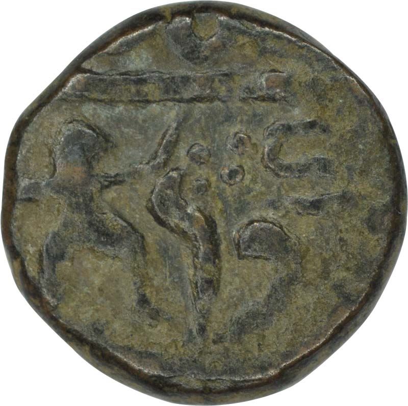 Dhar, Dump Coinage, Hanuman Series, Copper Paisa, In the name of Shah Alam II, Obv:lord hanuman (monkey god) standing right holding a banner, persian inscription, Rev:manus maimanat julus, zarb piran dhar, Rare to get the ones with clear mint name, 11.64g, 20.91mm, about very fine, Very Rare.