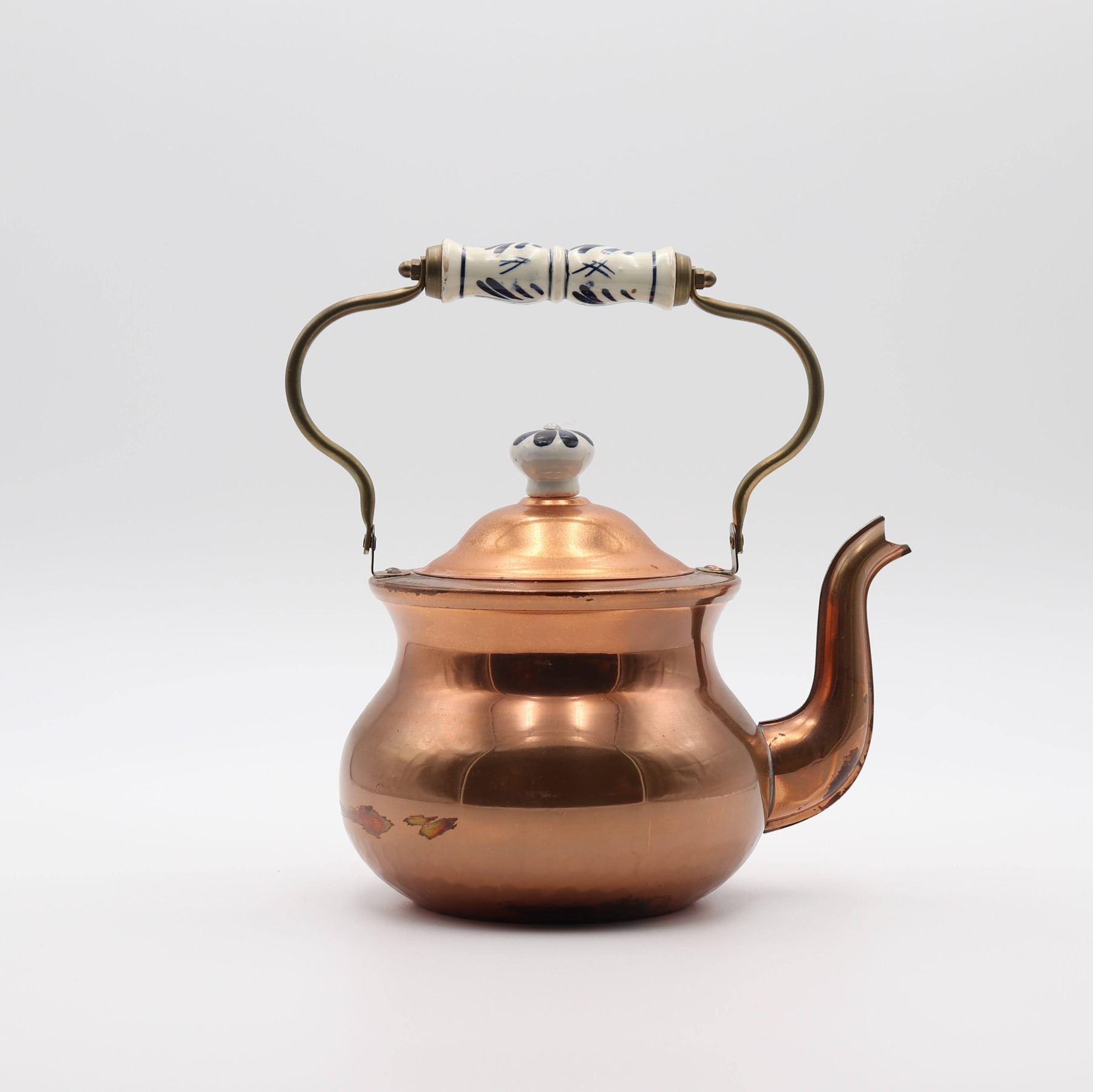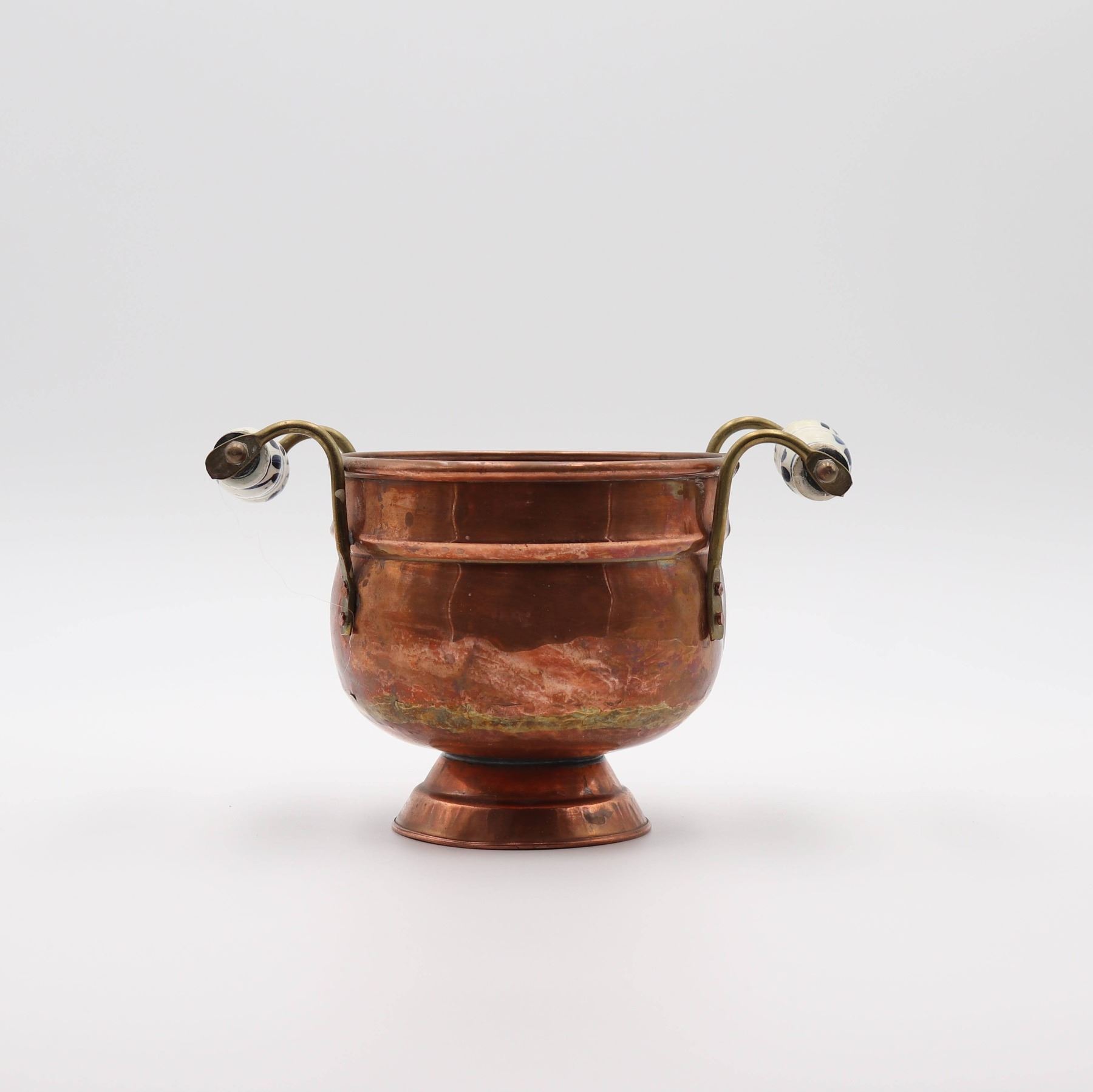 Delft blue and copper top, copper footed bowl with handles, decorative brass vase