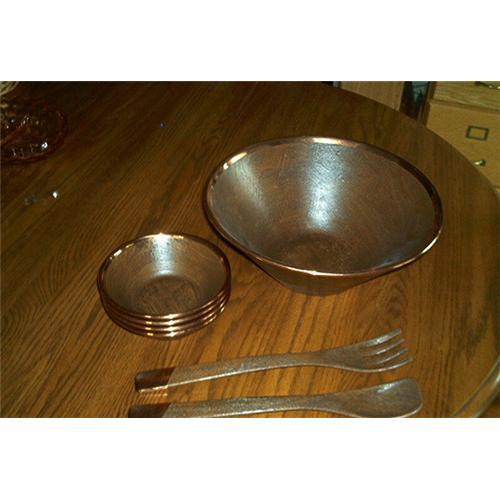 Featuring a beautiful salad set, made of wood and rims are all copper. The round gold/brown sticker states: "C.G"; COPPERCRAFT GUILD-TAUNTAN, MASS. Set includes a large salad bowl trimmed in copper; 4 salad bowls trimmed in copper and a fork and spoon with the top end trimmed in copper. The salad mixing bowl measures 4 3/4 inches tall; opening diameter of 12 inches; 4 salad bowls stands 2 inches tall with opening diameter of 6 inches; depth measures 2 inches. The fork and spoon measures 12 inches long. Appears that this set was never used. Excellent to mint condition,