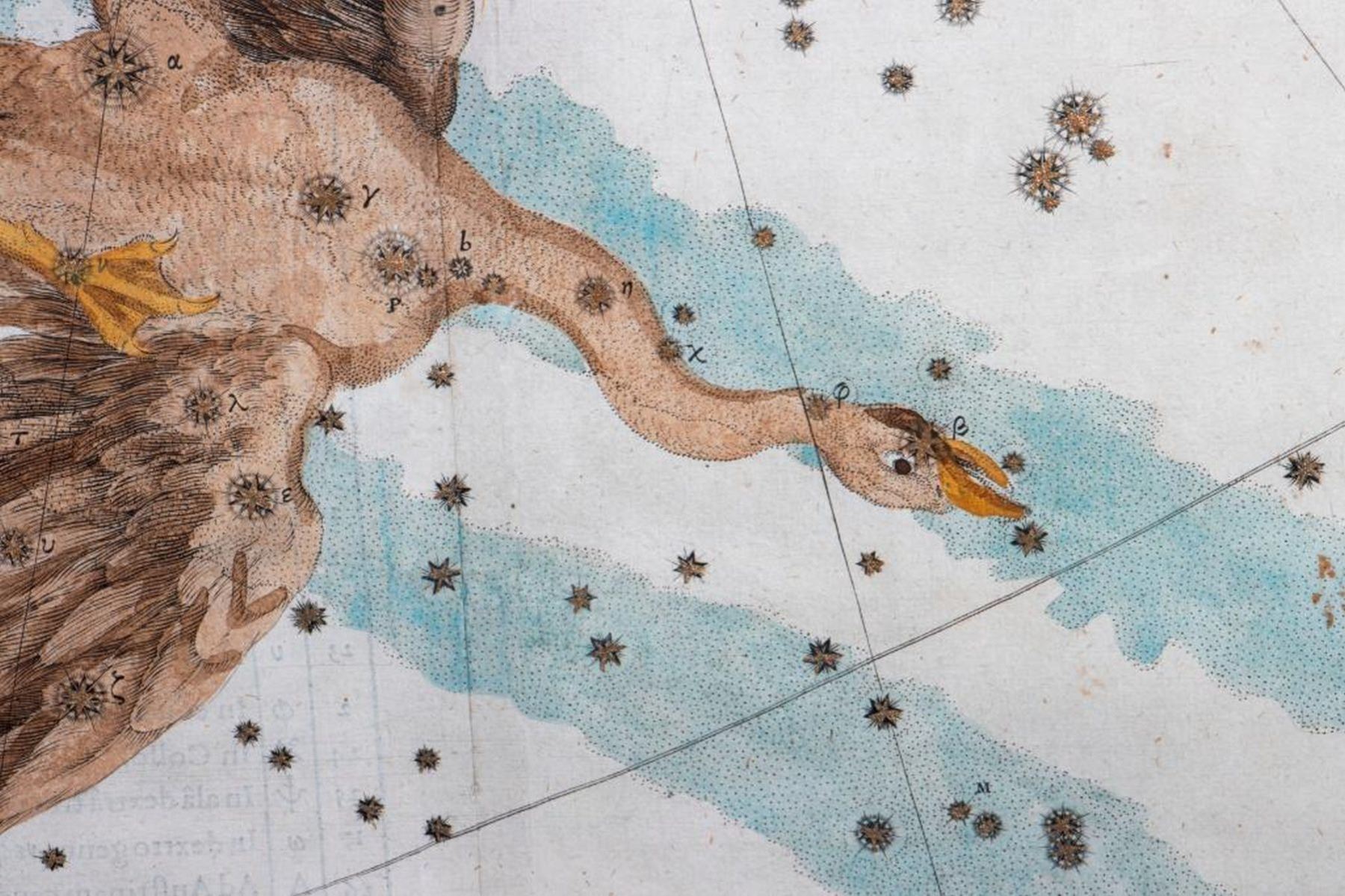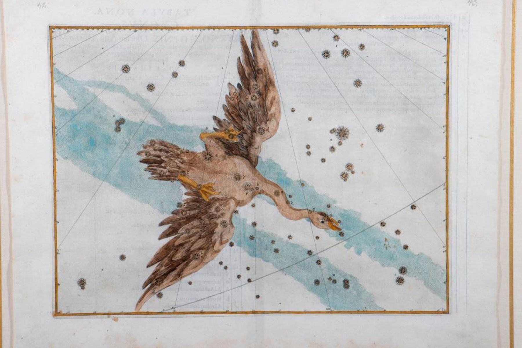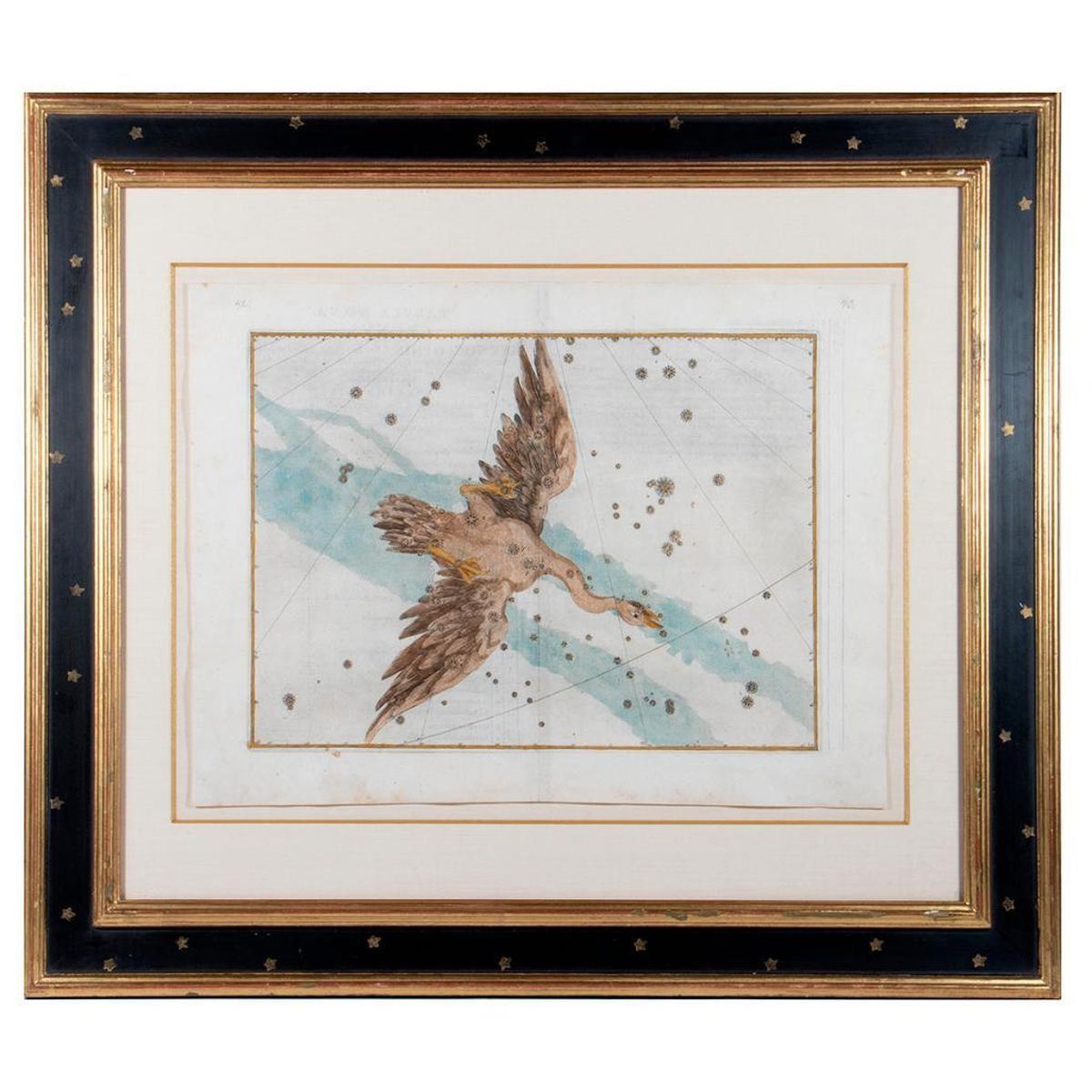 Copperplate engraving, hand-colored on laid paper. Cygnus from Uranometria. Originally published in1603, Augsburg. sight: 13 1/2in. x 17 1/2in. framed: 27in. x 24in.