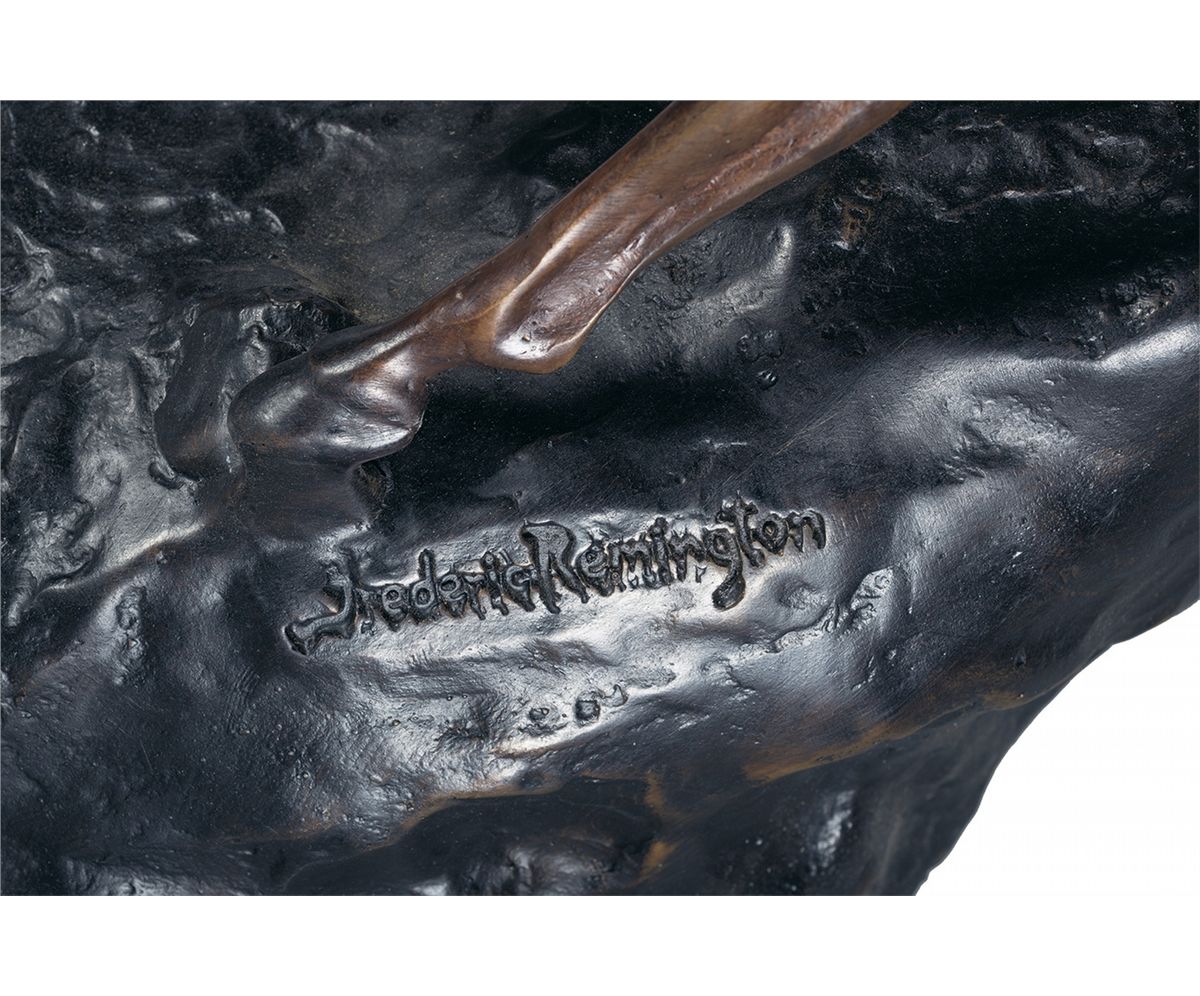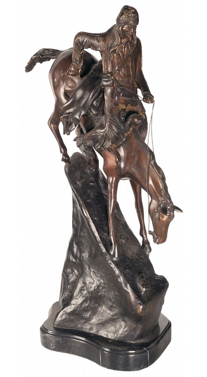 Measuring 27 inches tall including the marble plinth, this bronze depicts a man on horseback, riding down a steep incline. Bronze construction, with bronze strip details including the horse bridle and whip, and details including a set of three animal traps hanging from the saddle. One side of the incline is marked "Frederic Remington", with no foundry markings visible. Plinth is rounded green marble with a grooved edge.