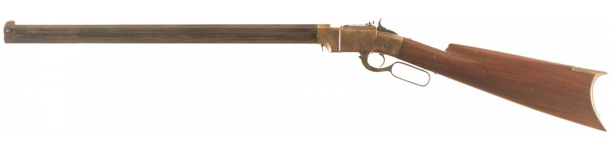Marked "THE VOLCANIC/REPEATING ARMS CO./PATENT NEW HAVEN CONN. FEB. 14, 1854". The serial number is marked on the right side of the lever. Brass blade front and elevation adjustable rear sights, brass frame and mounted with a smooth straight grip walnut stock with a brass crescent buttplate.