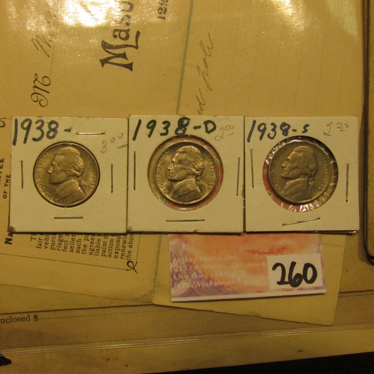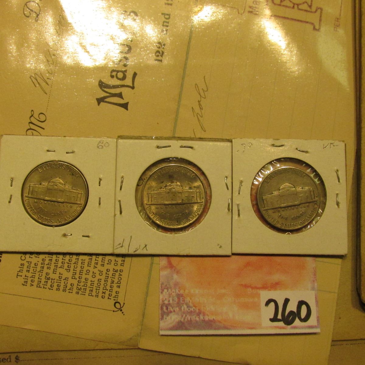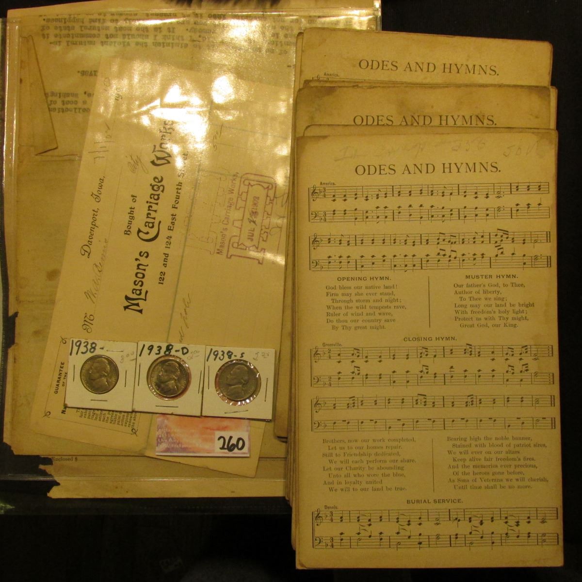 Copy of a letter written by Benjamin Franklin on marriage, very interesting; 1902 "Davenport, Iowa Bought of Mason's Carriage Works…" receipt; "Sons of Veterans, U.S.A. Application for Membership"; Group of old Church "Odes and Hymns." Cards; 1938P Unc, 38D Unc, & 38S VF Jefferson Nickels.