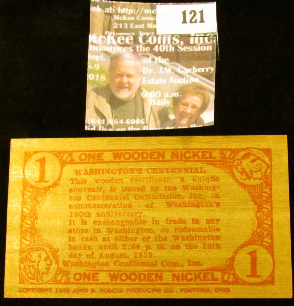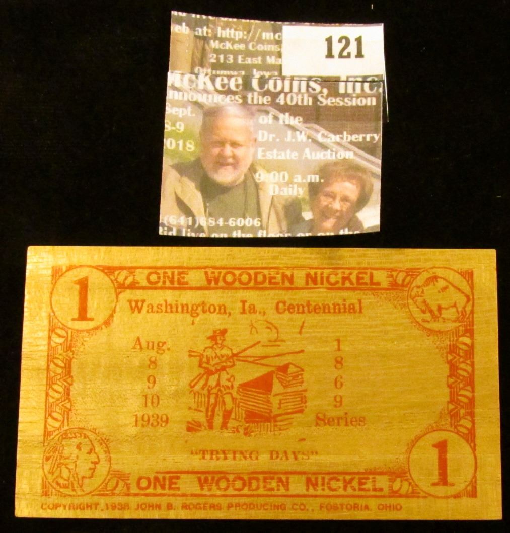 Copyright, 1938 Wooden Nickel "One Wooden Nickel/Washington, Ia. Centennial/Aug./8/9/10/1939/1/8/6/9