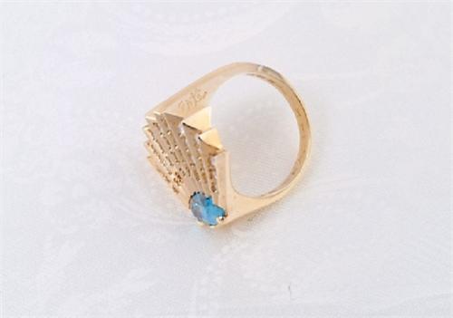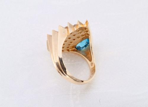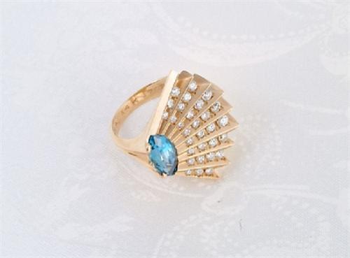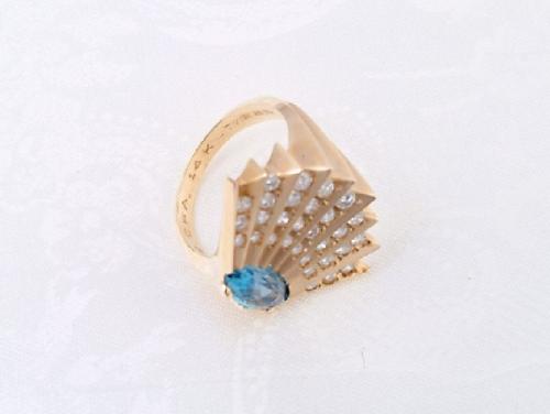 Erte, Romain de Tirtoff Conte (Russian/French 1892-1990) signed and editioned 7 of 225, 14 kt. yellow gold ring with 30 diamonds radiating from a marquis setting of blue topaz, 1" by 3/4"