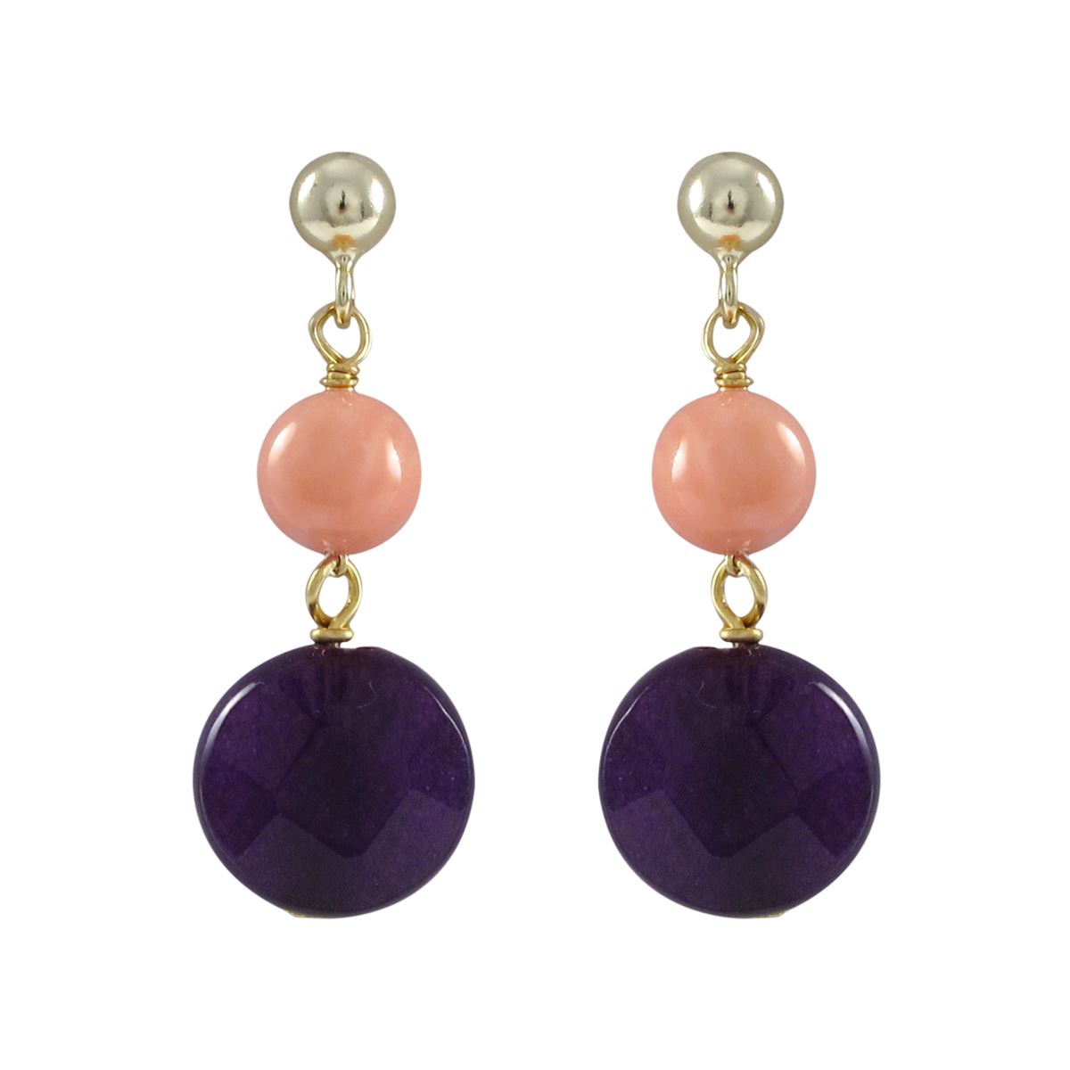 Coral 6Mm Round Ball And Amy 10Mm Round Flat Semi Precious Stones Dangling, On Gold Plated Sterling Silver 4Mm Ball Post Earrings, 1.10"