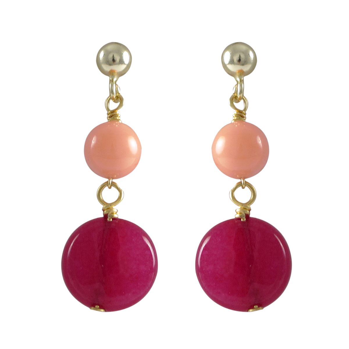 Coral 6Mm Round Ball And Fuschia 10Mm Round Flat Semi Precious Stones Dangling, On Gold Plated Sterling Silver 4Mm Ball Post Earrings, 1.10"