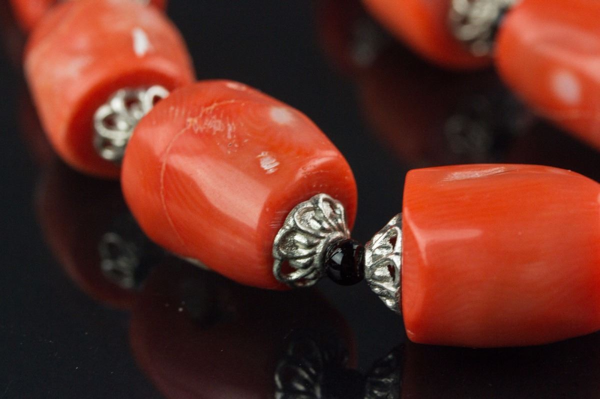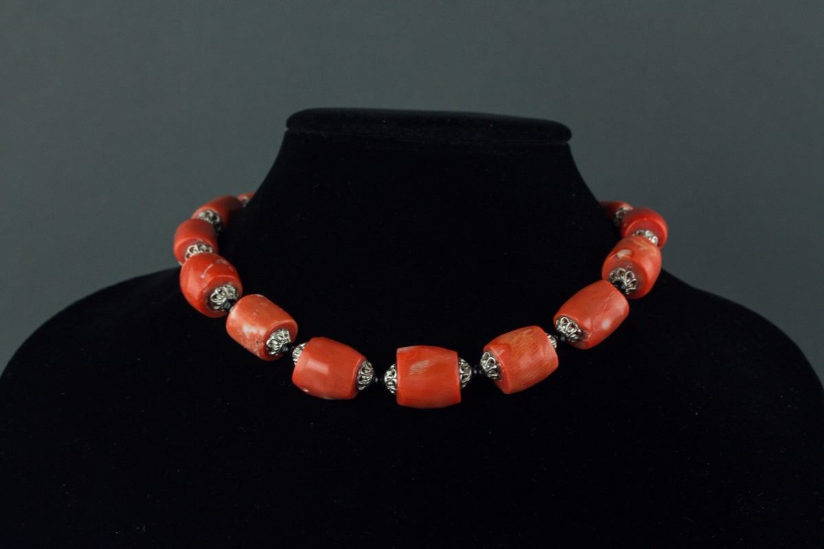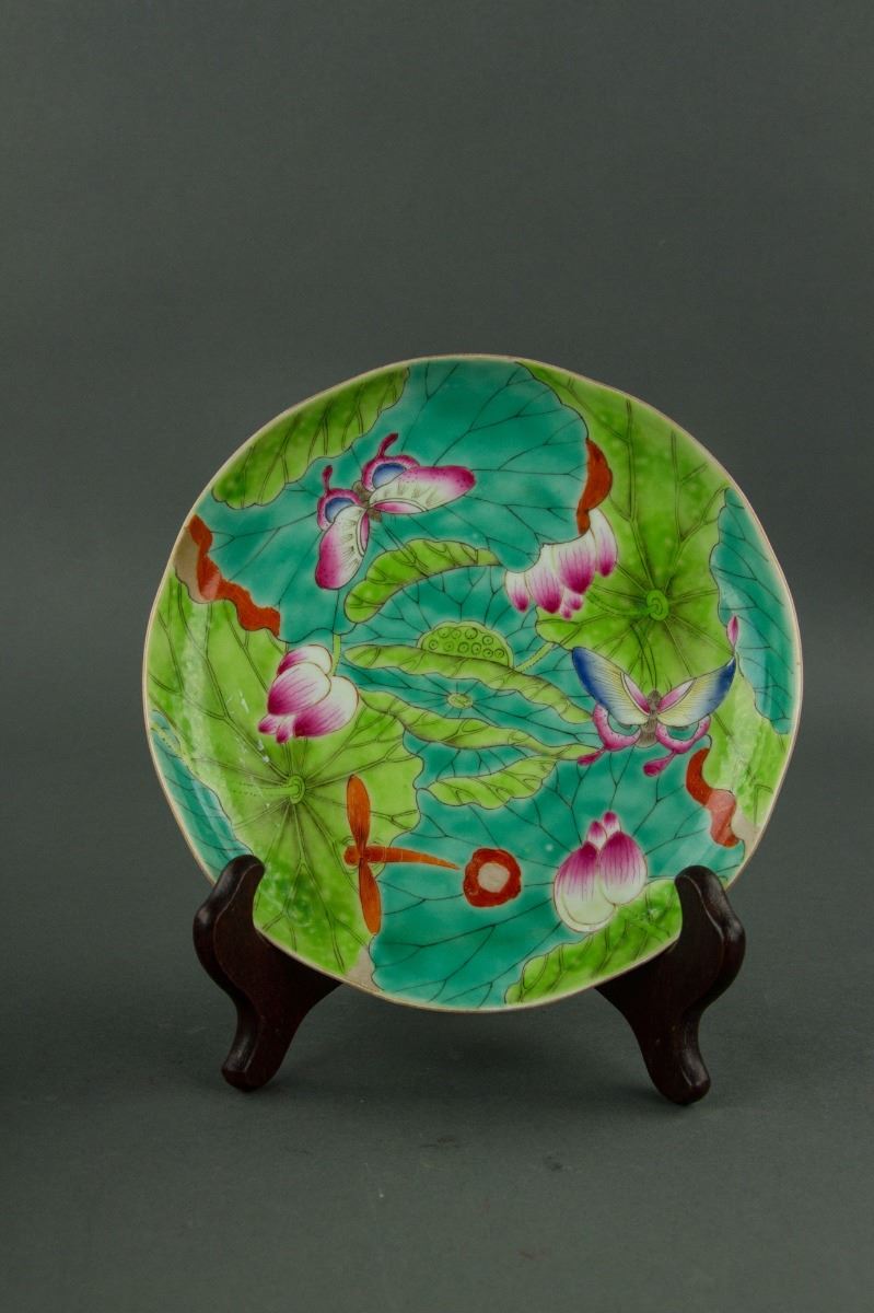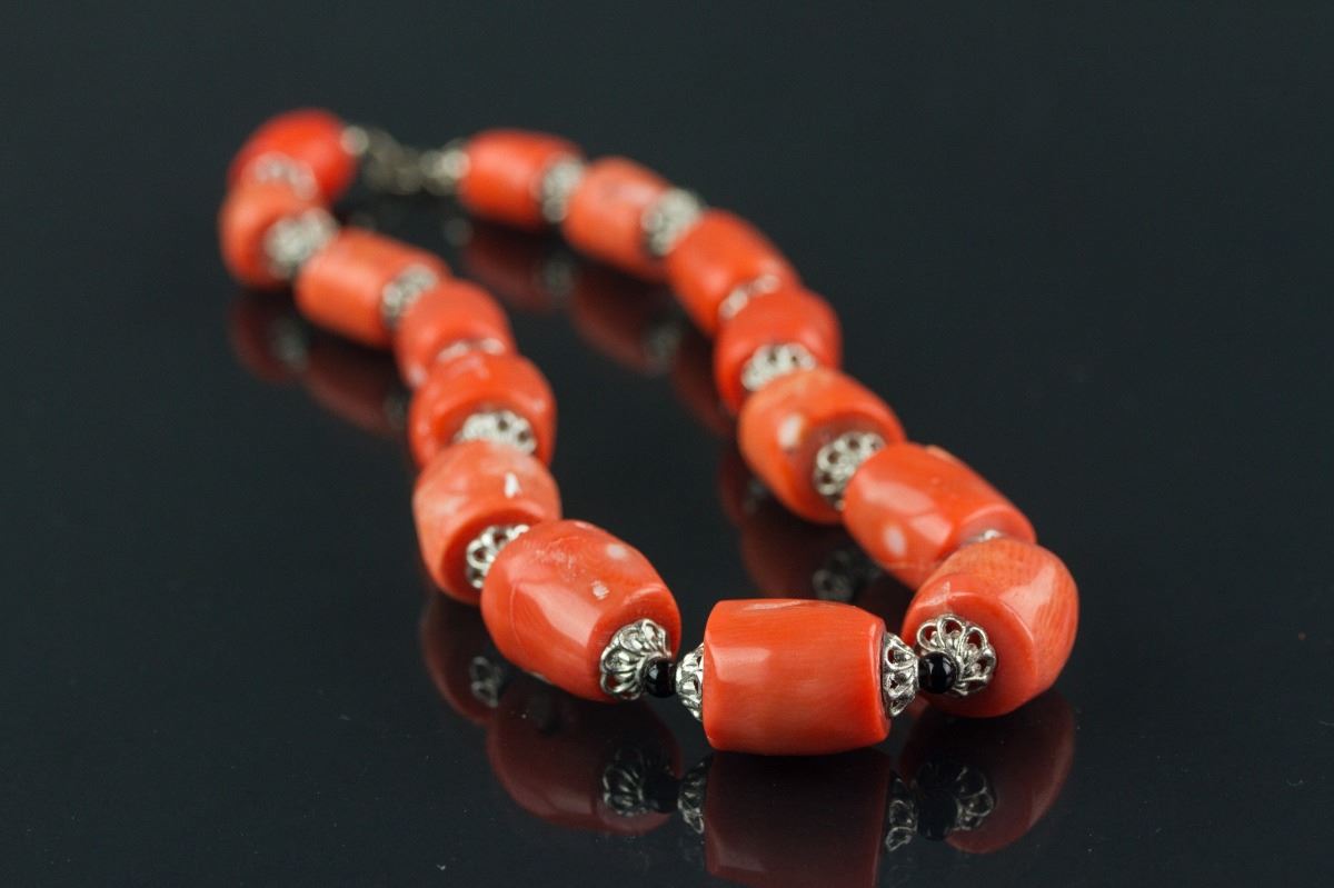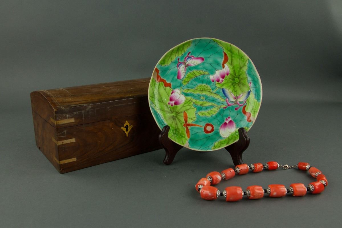 One coral bracelet, one wood jewellery box and a Chinese porcelain plate; bracelet comprised of natural coral beads in cylinder, with metal ring decoration; box painted leaf decoration inside; plate painted fish and lotus flower on it, 4-character "Xin Shan San Fang" mark on base; Bracelet: L: 44 cm, 113 grams, Box: H: 11 cm, W: 15 cm, L: 22.5 cm, 1152 grams, Plate: H: 3 cm, D: 17 cm, 195 grams