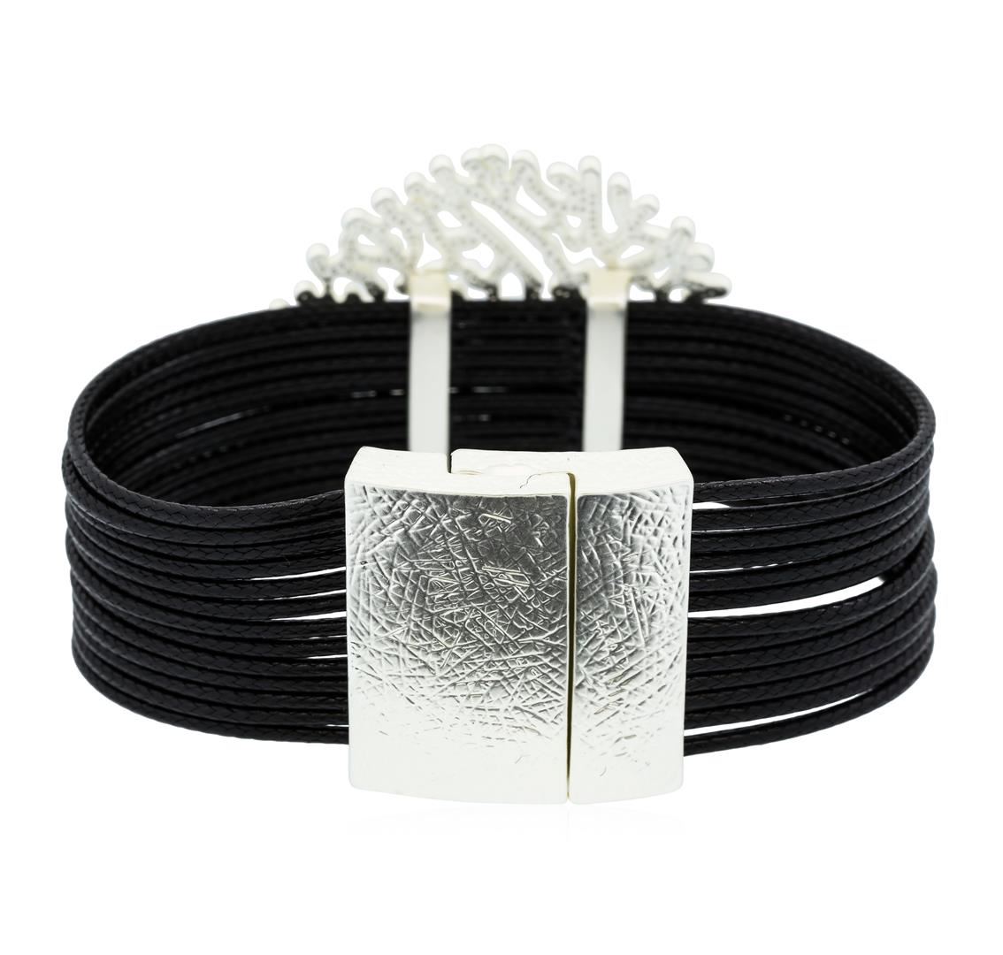 High end designer jewelry. Coral Branch Multi Strand Bracelet - Rhodium Plated. Rhodium Plated/ Mag Clasp. Black/ Silver. 7.5inches. Total Weight: 40 grams.