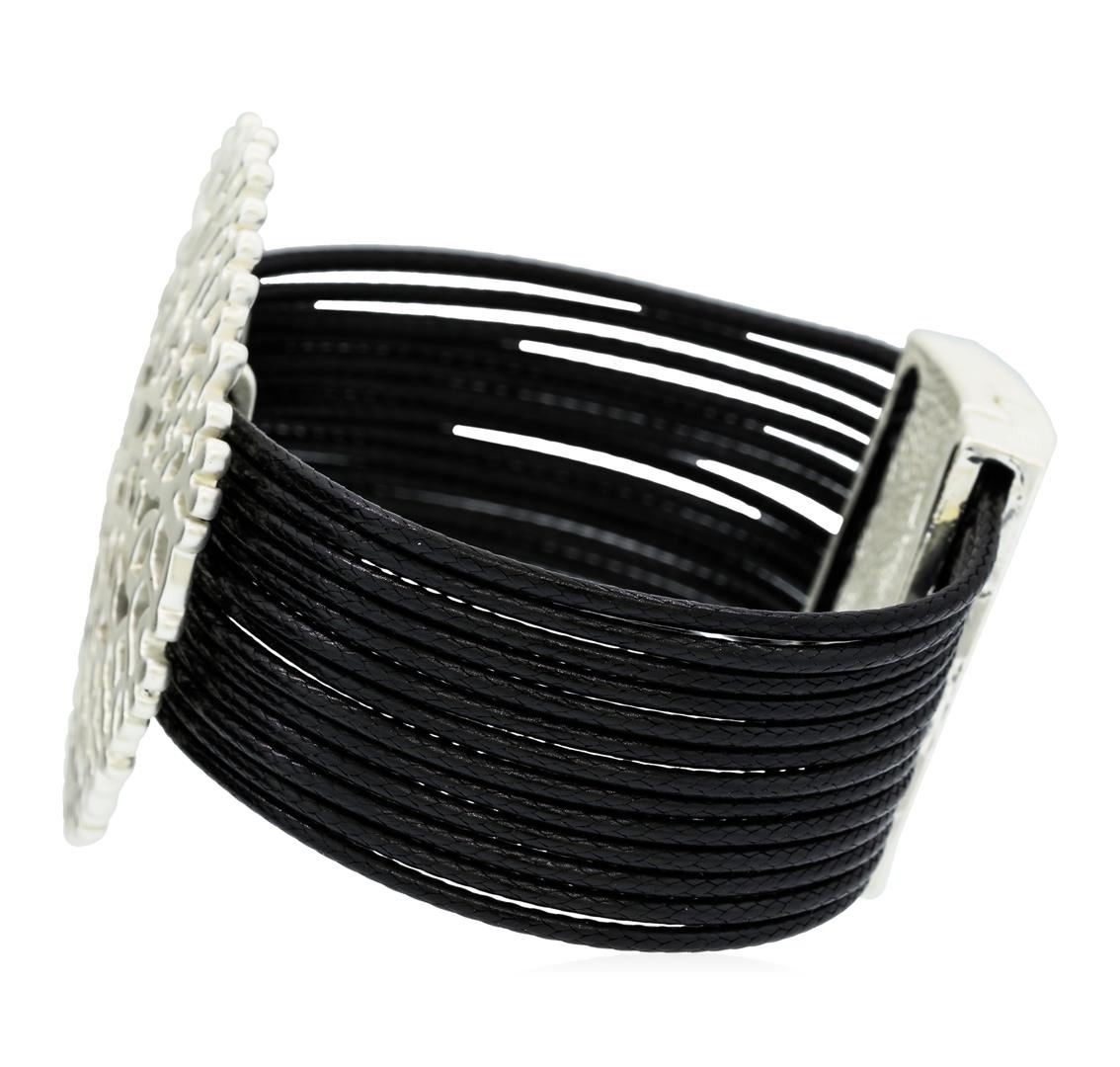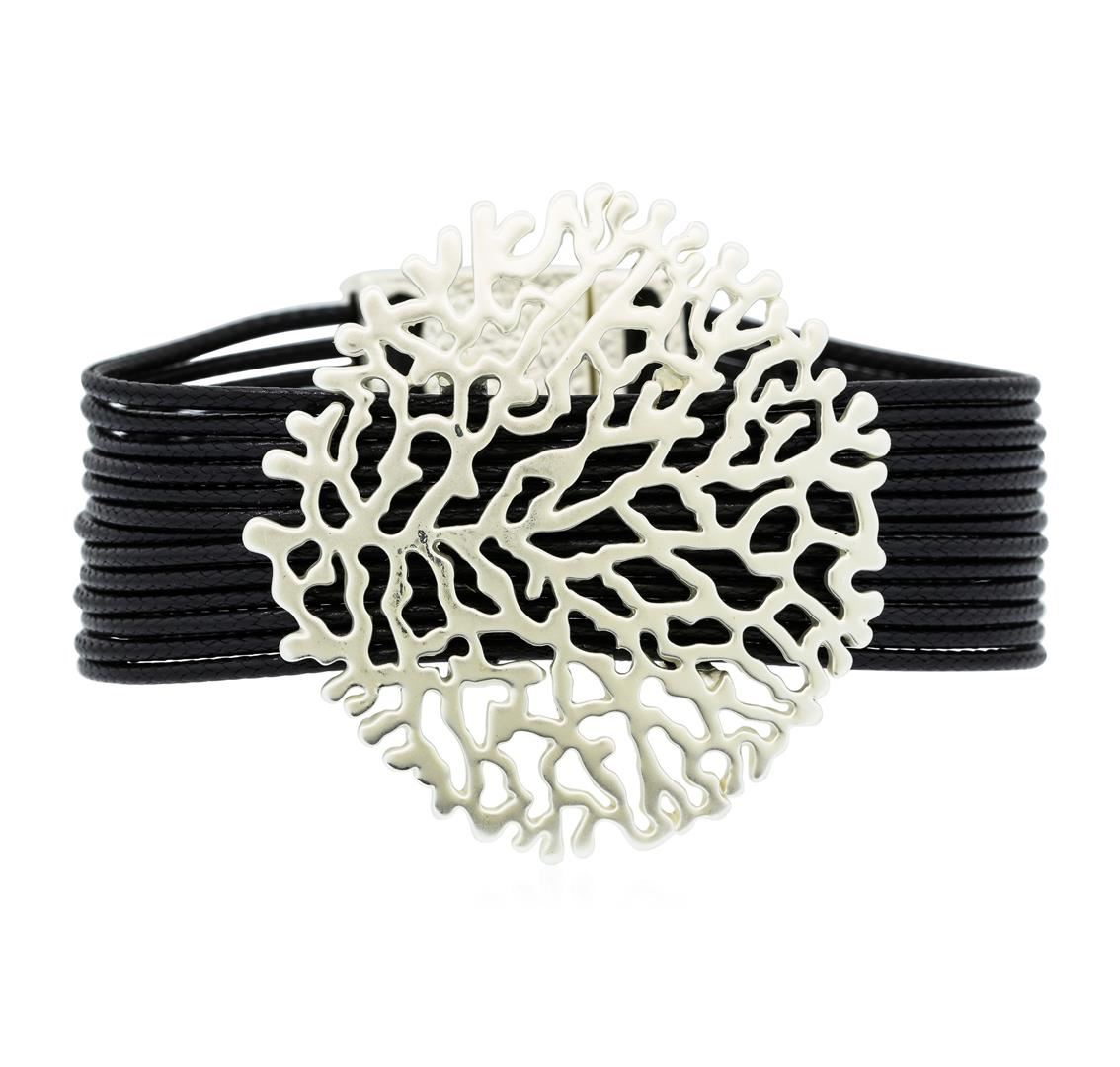 High end designer jewelry. Coral Branch Multi Strand Bracelet - Rhodium Plated. Rhodium Plated/ Mag Clasp. Black/ Silver. 7.5inches. Total Weight: 40 grams.