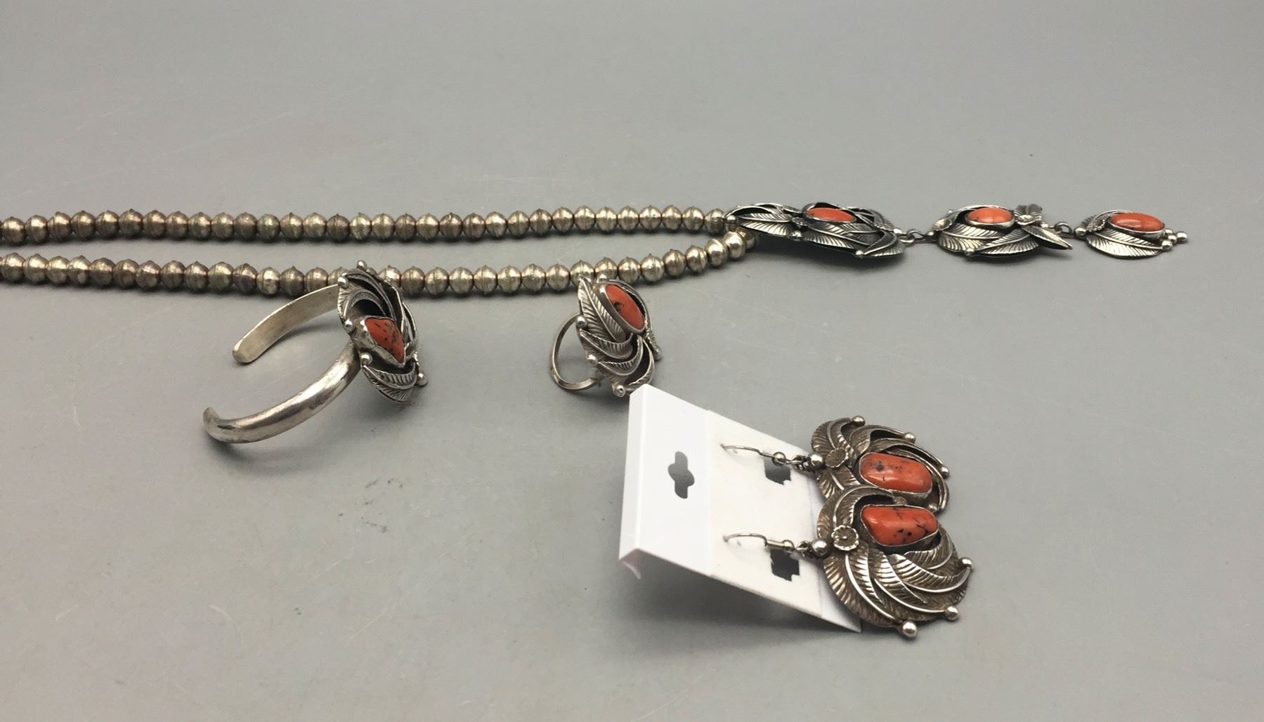 Description: For sale in this lot is a gorgeous coral set! Take a look! It has a necklace, bracelet, ring and earrings, all set with nice coral and silver leaf appliqué accents. Stamped as being sterling silver on the pendant. Maker: Unmarked. Approx. Age: Vintage. Size: Necklace fits a 18” neck, pendant measures 5-3/8” long x 1-1/2” wide. Earrings measure 1-1/2” long x 1-1/2” wide. Ring is a size 5-1/2. Bracelet Inside circumference measures 4-7/8” long, opening is additional 7/8”, fitting a 5-3/4” wrist. Width is 1-1/2”. Combined weight is 116.6 grams. Condition: Good for their ages, normal wear expected. Please look closely at the pictures - they are an important part of our description. Shipping: There will be a $5 handling / packaging fee for shipping this lot. The actual cost of postage will be added on top of that.