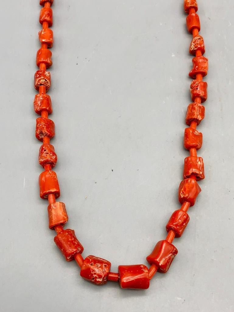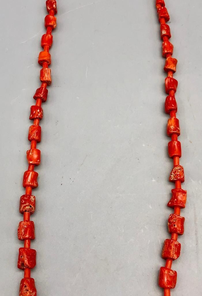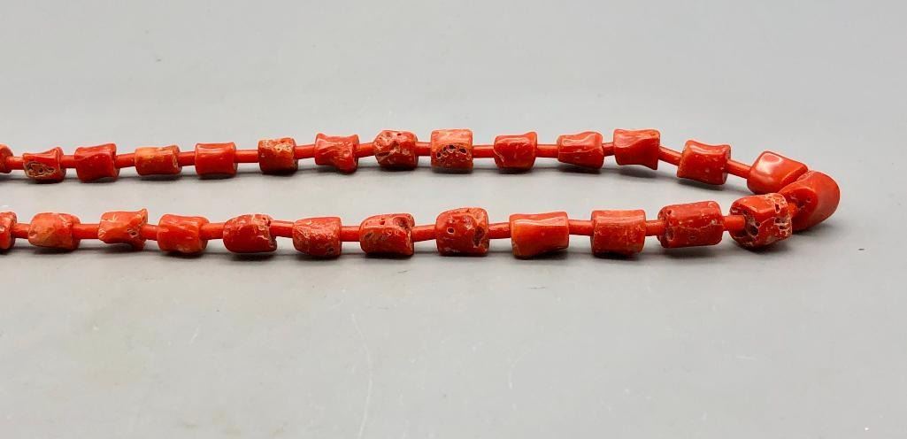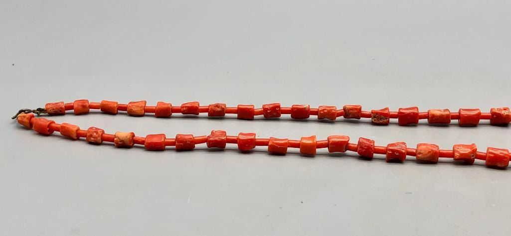 For sale in this lot is a coral necklace. This is a great, older coral necklace that has a nice alternating pattern of smaller coral beads with larger branch coral beads in a slight graduated size style. It is strung on a waxed cord. MAKER: Unmarked. APPROX AGE: Circa 1950s. SIZE: Fits a 25 inch neck. Weighs 39 grams. CONDITION: Good for its age, normal wear expected. Please look closely at the pictures as they are an important part of our description and are hereby incorporated into the description, specifically with regards to condition. SHIPPING: There will be a $5 handling / packaging fee for shipping this lot. The actual cost of postage will be added on top of that. BUY IT NOW: If you would like to buy this item now, without waiting for the auction day to bid on it, we do offer this option (which is available up to 48 hours before the actual auction starts). The “Buy it Now†price is the high estimate of this lot (plus applicable fees and the Buyer's premium is discounted to 10% when using the Buy it Now option). If you would like to exercise this option, you must contact us by email (or phone as long as you talk to someone live). Reference this lot number and your intention to "Buy it Now."