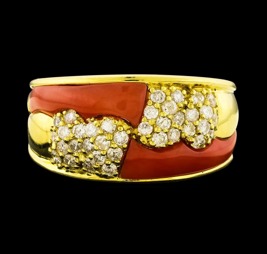 One ring featuring: 18KT Yellow Gold containing Coral and Diamonds with a total weight of 0.52ct. Total Weight of Ring: 8 grams.