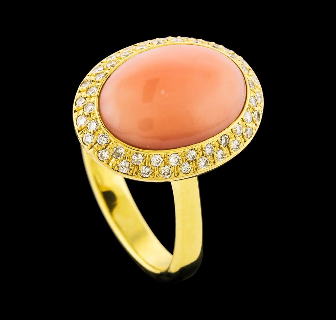 One ring featuring: 18KT Yellow Gold containing Coral and Diamonds with a total weight of 0.38ct. Total Weight of Ring: 10 grams.