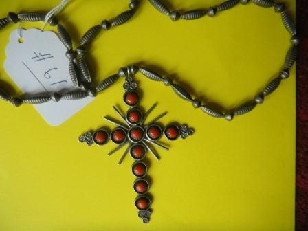 Red Coral and Sterling Cross. The cross measures approximately 5 by 3 inches. It is attached to a sterling silver chain. Overall length is approximately 30 inches. There are eleven perfectly matched coral stones. This item is from an old estate. Circa 1950. Excellent Condition. Shipping $15.00