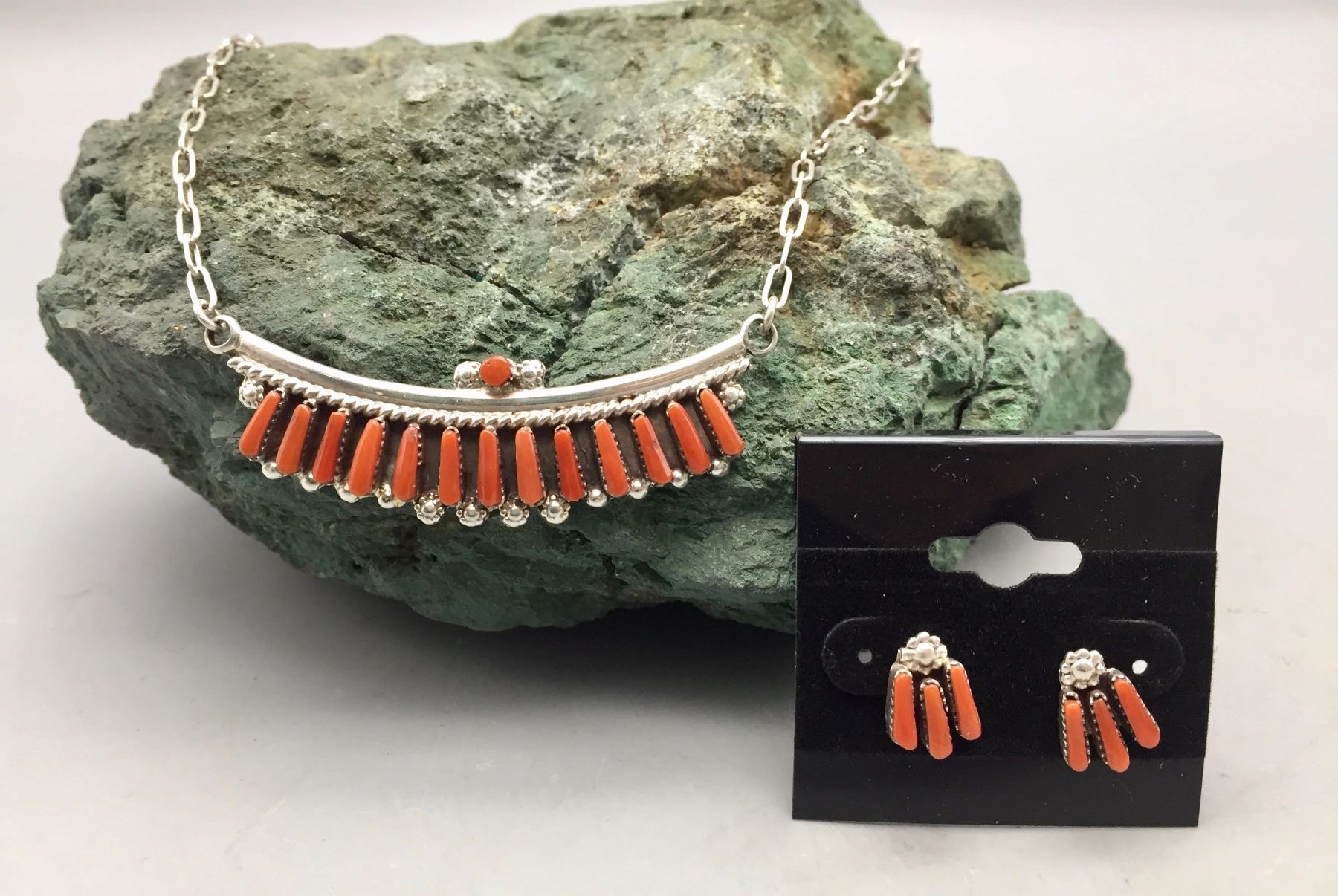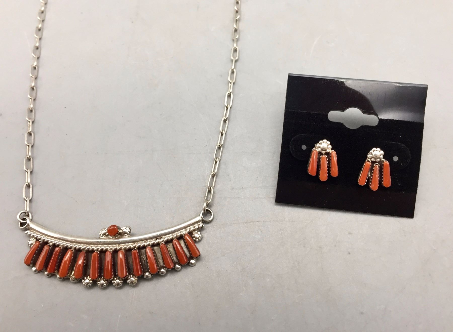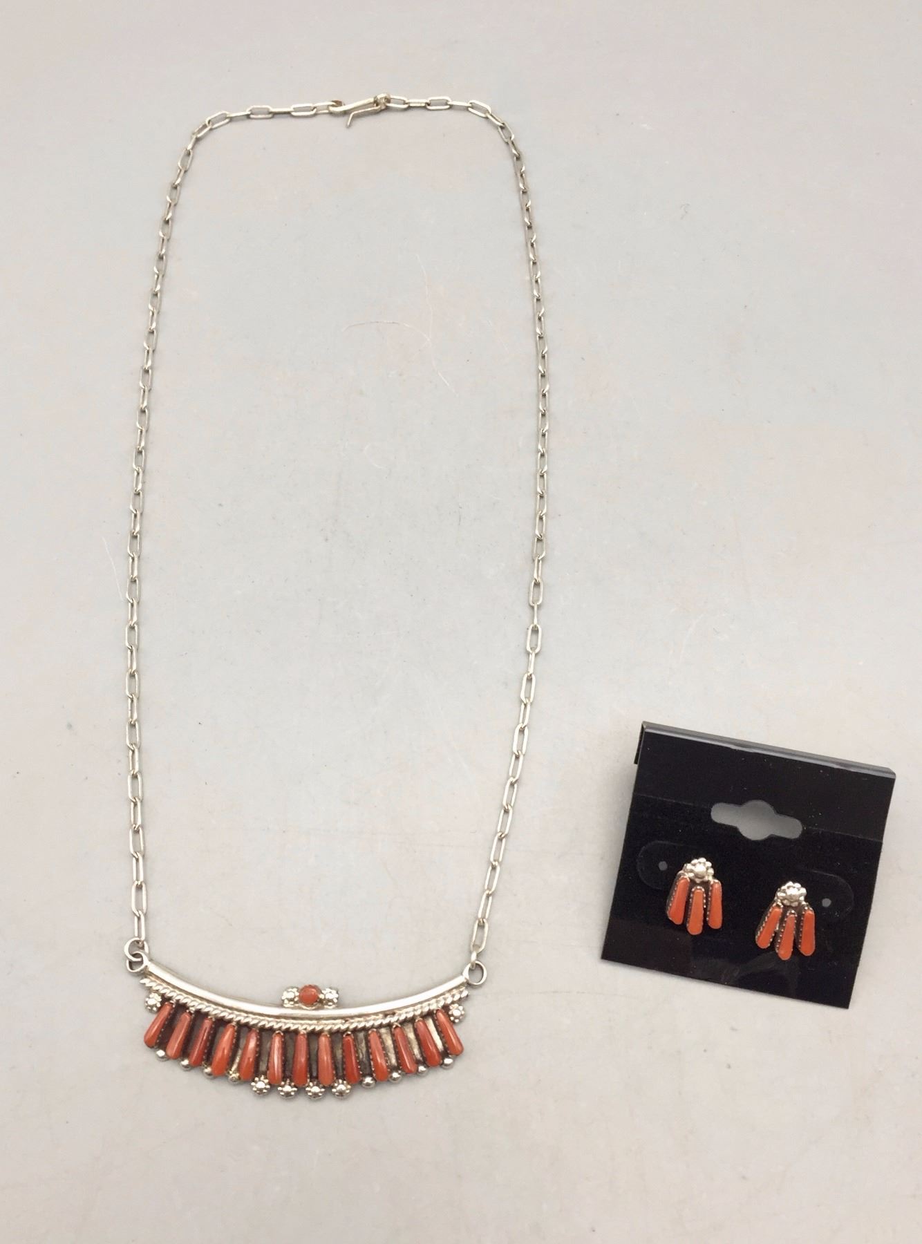 Description: Nice coral and sterling silver necklace and earrings set. The necklace has 14 smaller coral cabochons. Maker: No hallmark observed. Approx. Age: Circa 1980s. Size: Necklace fits a 16-1/2” neck. Combined weights of 12.6 grams. Condition: Good for its age, normal wear expected. Please look closely at the pictures - they are an important part of our description. Shipping: There will be a $5 handling / packaging fee for shipping this lot. The actual cost of postage will be added on top of that.
