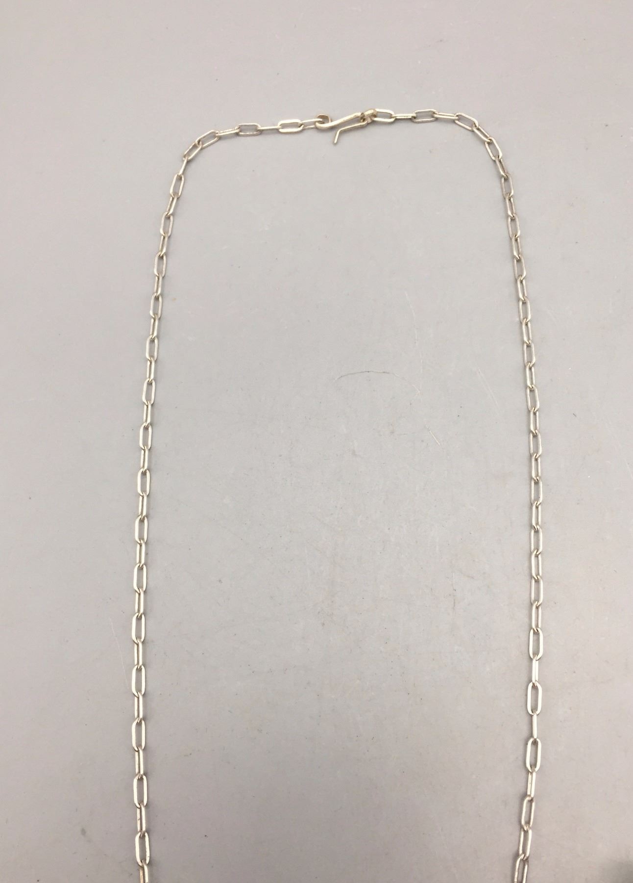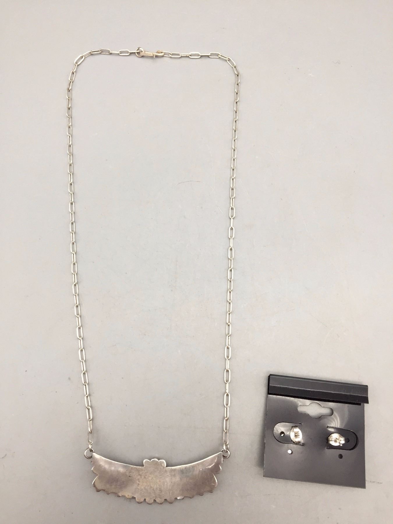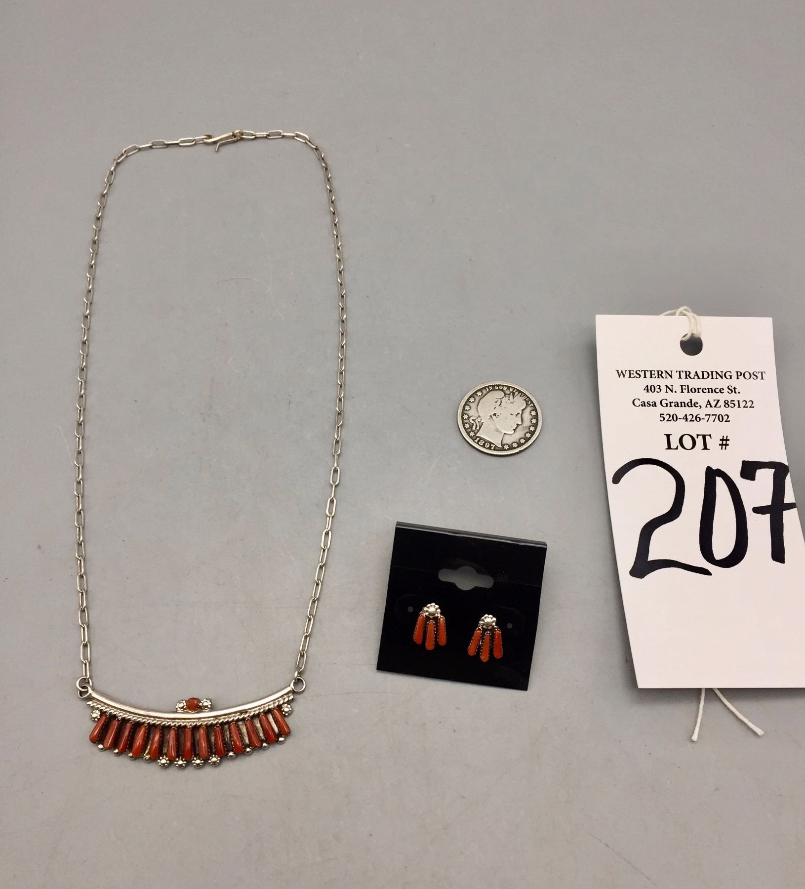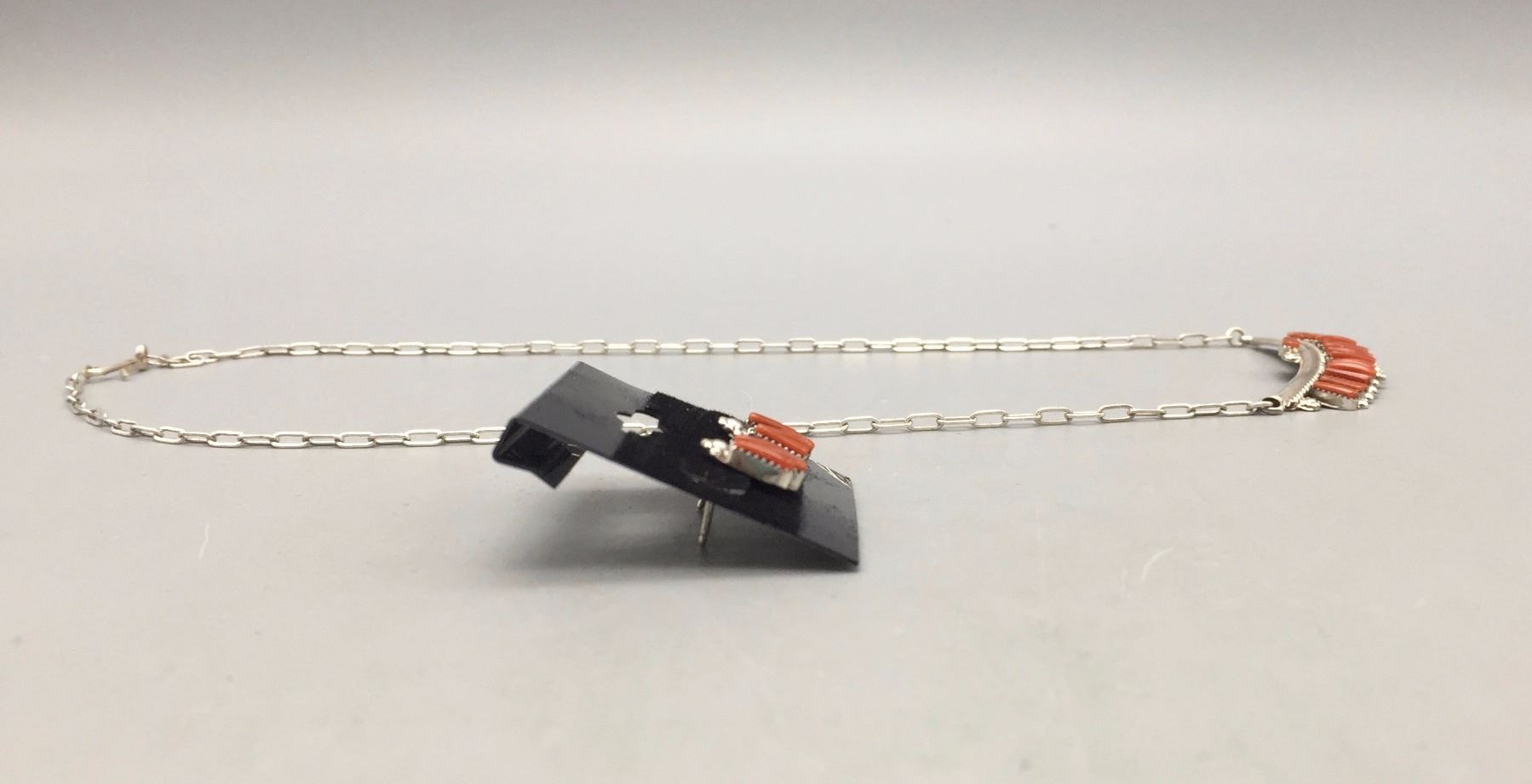 Description: Nice coral and sterling silver necklace and earrings set. The necklace has 14 smaller coral cabochons. Maker: No hallmark observed. Approx. Age: Circa 1980s. Size: Necklace fits a 16-1/2” neck. Combined weights of 12.6 grams. Condition: Good for its age, normal wear expected. Please look closely at the pictures - they are an important part of our description. Shipping: There will be a $5 handling / packaging fee for shipping this lot. The actual cost of postage will be added on top of that.