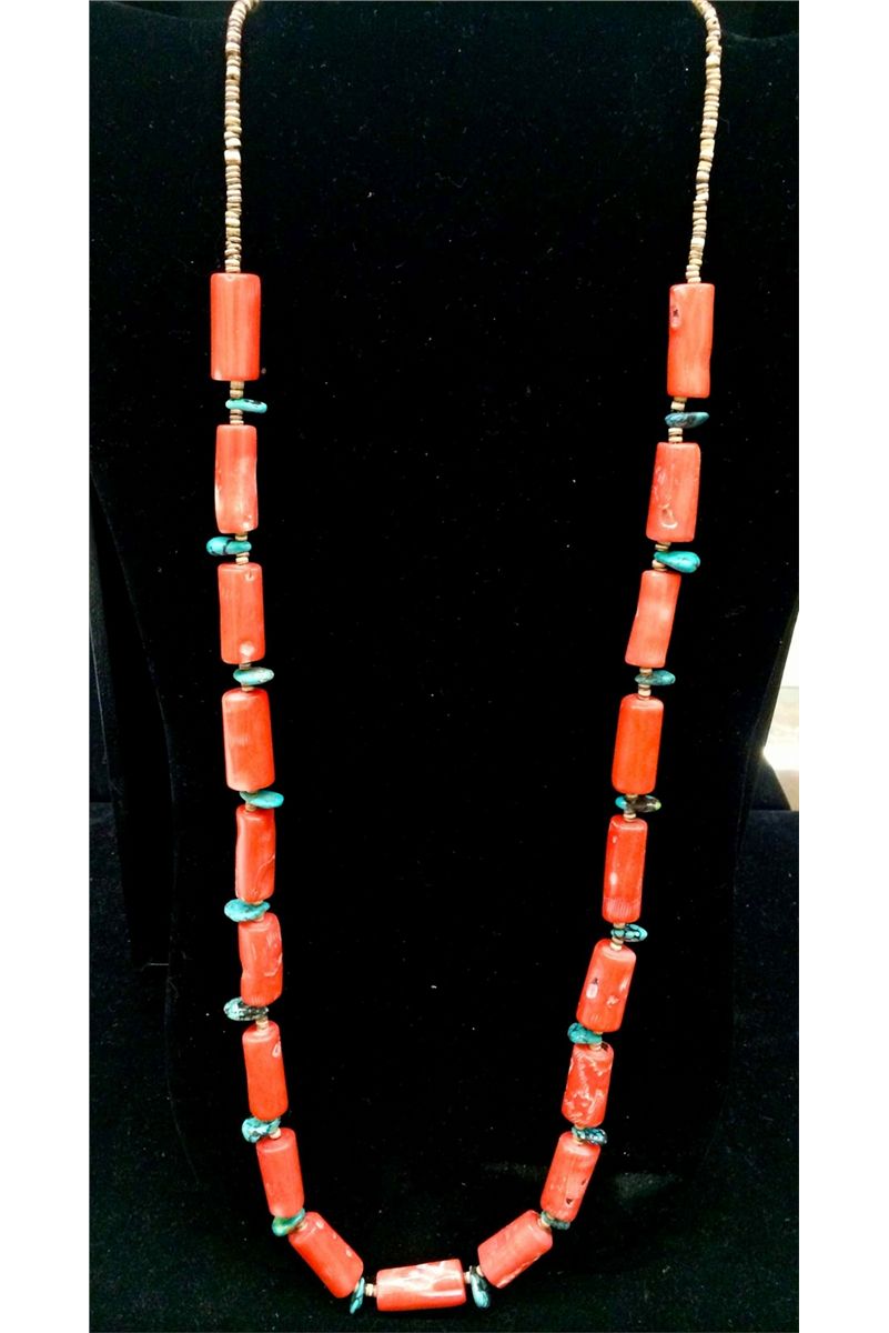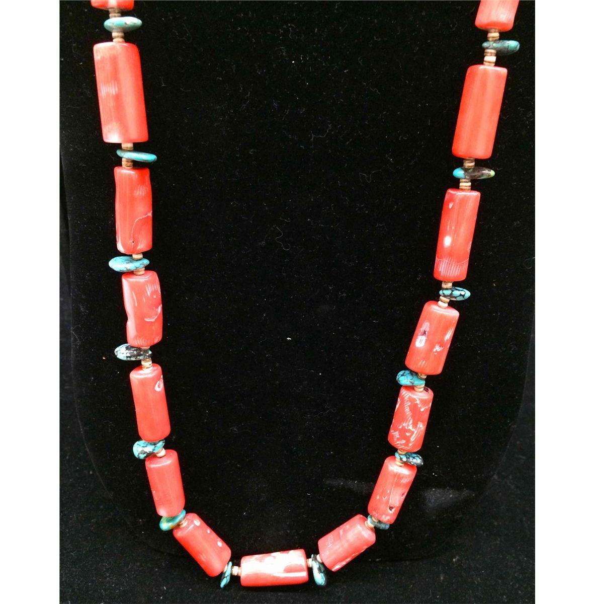 A beautifully done, 30" necklace made with heishi beads, coral and turquoise.