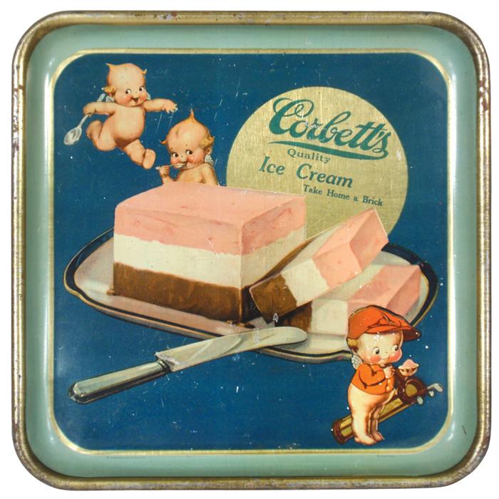 Corbett's Ice Cream tray, litho on tin, featuring Kewpies & Neapolitan "Brick" ice cream, VG cond, 13.5" square.