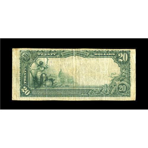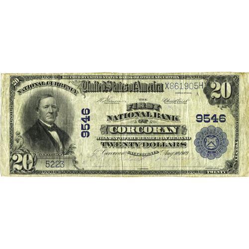 <B>Corcoran, CA</B></I> - $20 1902 Plain Back Fr. 652 <B>The First NB</B></I> Ch. # 9546<BR>This <B>Fine+</B></I> $20 traces its pedigree back to our landmark offering of the Charles Colver collection in 1999. This bank only has two documented large notes and the other note is locked away in a major California collection. The purple signatures appear stamped a little higher than normal.