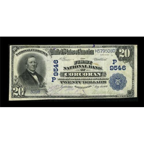 <B>Corcoran, CA</B></I> - $20 1902 Plain Back Fr. 652 <B>The First NB</B></I> Ch. # (P)9546<BR> This is one of just two large notes reported from this central California community, and has been ensconced in the Kansas City collection holdings for the last four decades. It's almost the perfect twin in grade to the other large example from Corcoran, which we sold in 2006 for $3450. Expect this <B>Fine-Very Fine</B></I> piece to fetch about the same amount tonight. <BR><I>From The Kansas City Collection.</B></I><BR><BR><b>Shipping:</b> Coins & Currency (<a target="_blank" href="http://www.heritageauctions.com/common/shipping.php">view shipping information</a>)