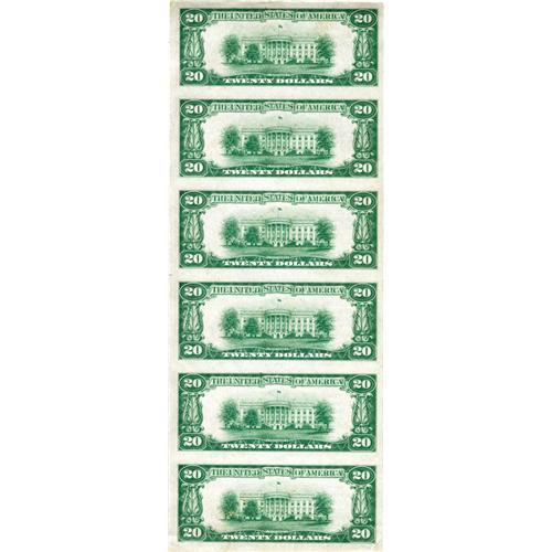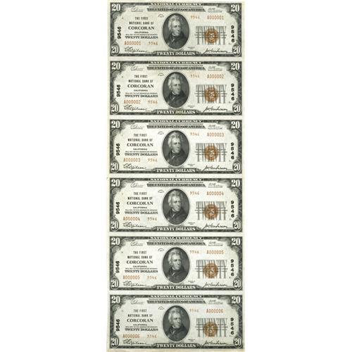 <B>Corcoran, CA</B></I> - $20 1929 Ty. 2 <B>The First NB</B></I> Ch. # 9546 Uncut Sheet<BR> Two uncut sheets are known from this northern California bank, accounting for twelve of the eighteen reported examples from here. Both sheets are number 1 Type 2 sheets, with this the considerably nicer of the pair. There is one light fold on the top note, and a couple of corner folds on the bottom note, but no folds between any of the notes, leaving most of the notes Gem in quality. <B>Choice Crisp Uncirculated, </B></I>a premium California sheet. <BR><BR><b>Shipping:</b> Coins & Currency (<a target="_blank" href="http://www.heritageauctions.com/common/shipping.php">view shipping information</a>)
