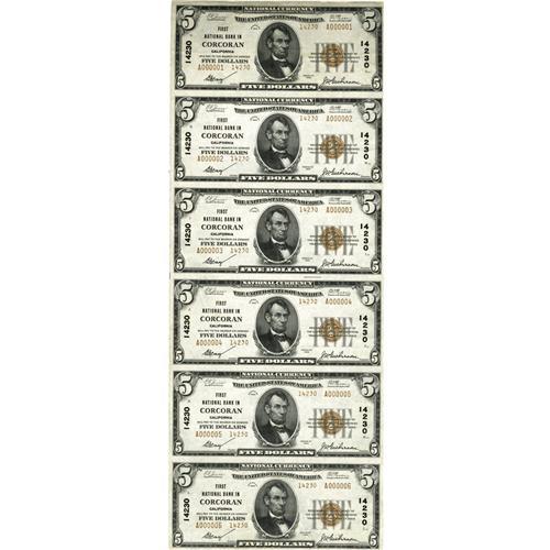<B>Corcoran, CA</B></I> - $5 1929 Ty. 2 <B>First NB</B></I> Ch. # 14230 Uncut Sheet<BR> This is an extraordinarily rare sheet from an extraordinarily rare 14000 charter bank. Just one single note is known from this institution, an item we have sold twice. Once in 1995, when it realized $1650, and again in the 2004 Horwedel sale, when it fetched a considerably stronger $6612.50. This number 1 sheet is the sole sheet known from here, and has never been offered at public sale until its appearance here tonight. There are a couple of light folds through most of the notes, but the sheet is bright, unmolested, and of the eighty-seven California uncut sheets known, the only California 14000 charter sheet. <B>About Uncirculated. </B></I> <BR><BR><b>Shipping:</b> Coins & Currency (<a target="_blank" href="http://www.heritageauctions.com/common/shipping.php">view shipping information</a>)