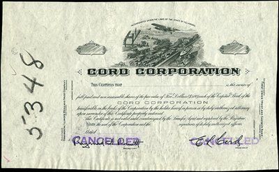 DE. Proof certificate of vignette, title and text without border. Vignette has a tri-motor airplane flying over speedboats, Dusenberg and Auburn Automobiles. Cord, the head of the Cord Corporation, owned two aviation companies, Stinson Aircraft and Lycoming Motors, two automoblie companies, Auburn and Dusenberg, and five other engine manufacturers. In January 1932, Cord formed the Airplane Development Corporation as a subsidiary of the Cord Corporation, with Vultee as chief engineer, to begin work on the Vultee V-1 transport. In early 1932, Cord faced labor problems with his airlines pilots and he sold both airlines to American Airways in exchange for seven percent of the stock of American's parent company, the Aviation Corporation. By late 1932, Cord had purchased 30 percent of the stock in the Aviation Corporation and after a bitter stockholder's battle, Cord gained control of the company. In 1934, Aviation Corporation was required to divest American Airways which was promptly renamed American Airlines. Facsimile signature of E.L. Cord. Rare and historic certificate. SBNC. Fine.