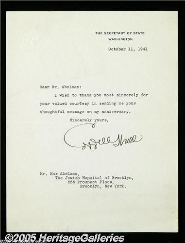 <B>Cordell Hull, Secretary of State Under Franklin D. Roosevelt</B></I> Typed letter signed, "Cordell Hull", 7" x 9", Washington, October 11, 1941 to Mr. Max Abelman thanking him for, "...your thoughtful message on my anniversary..." Near perfect condition <I>Accompanied by COA from PSA/DNA.</B></I>