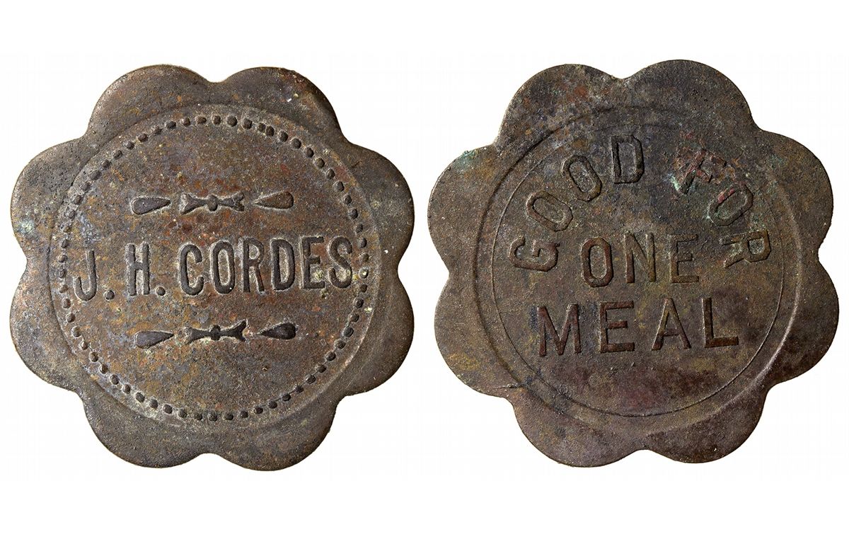 c1900 J.H. Cordes, Good for One Meal, Brass, 29mm, scallop (8) R7. Rare shape and inspricption on this piece. The ghost town of Cordes was established in 1883 by John H. Cordes, and was located 8 miles southwest of the town of Mayer. Bud Bassett Collection - HKA#65314