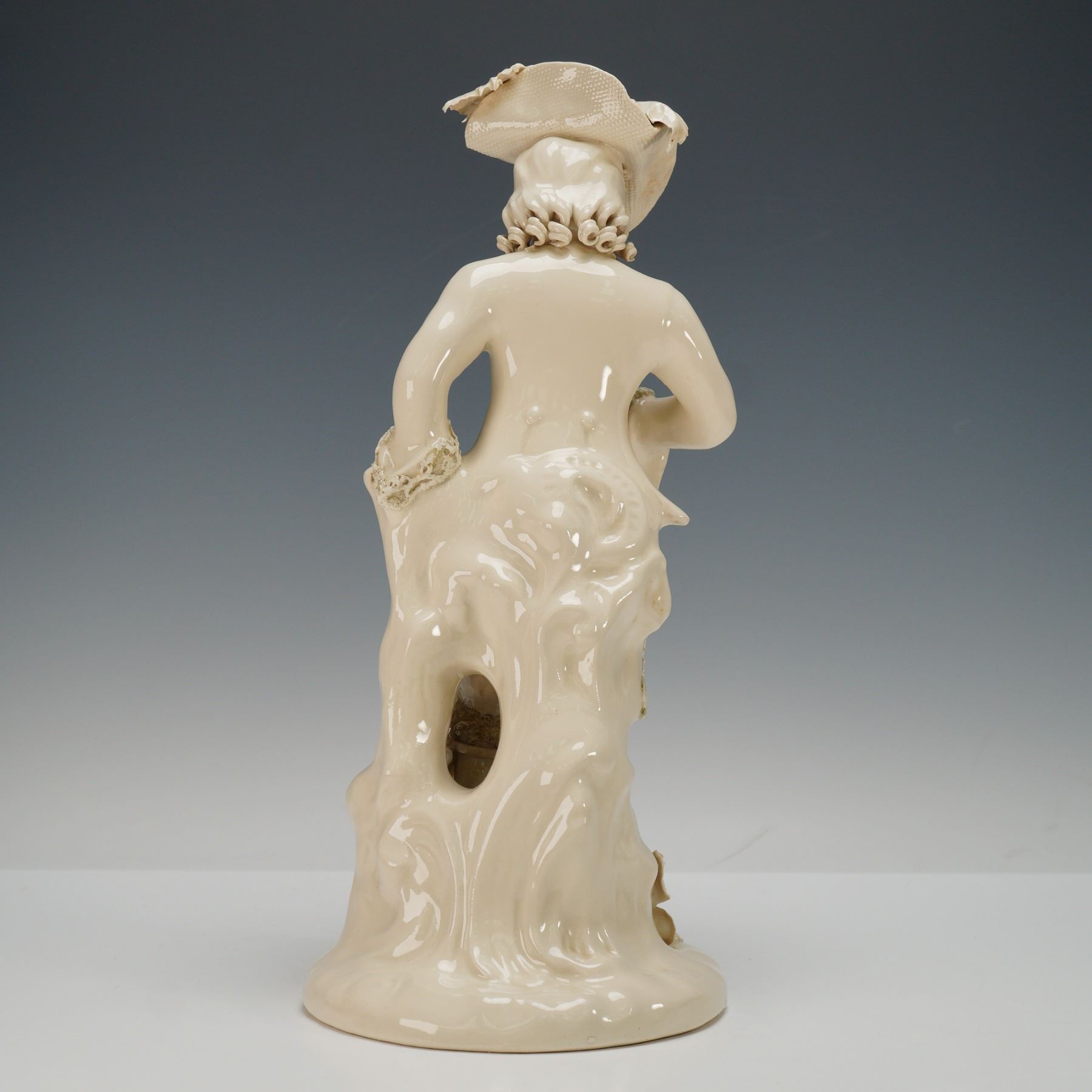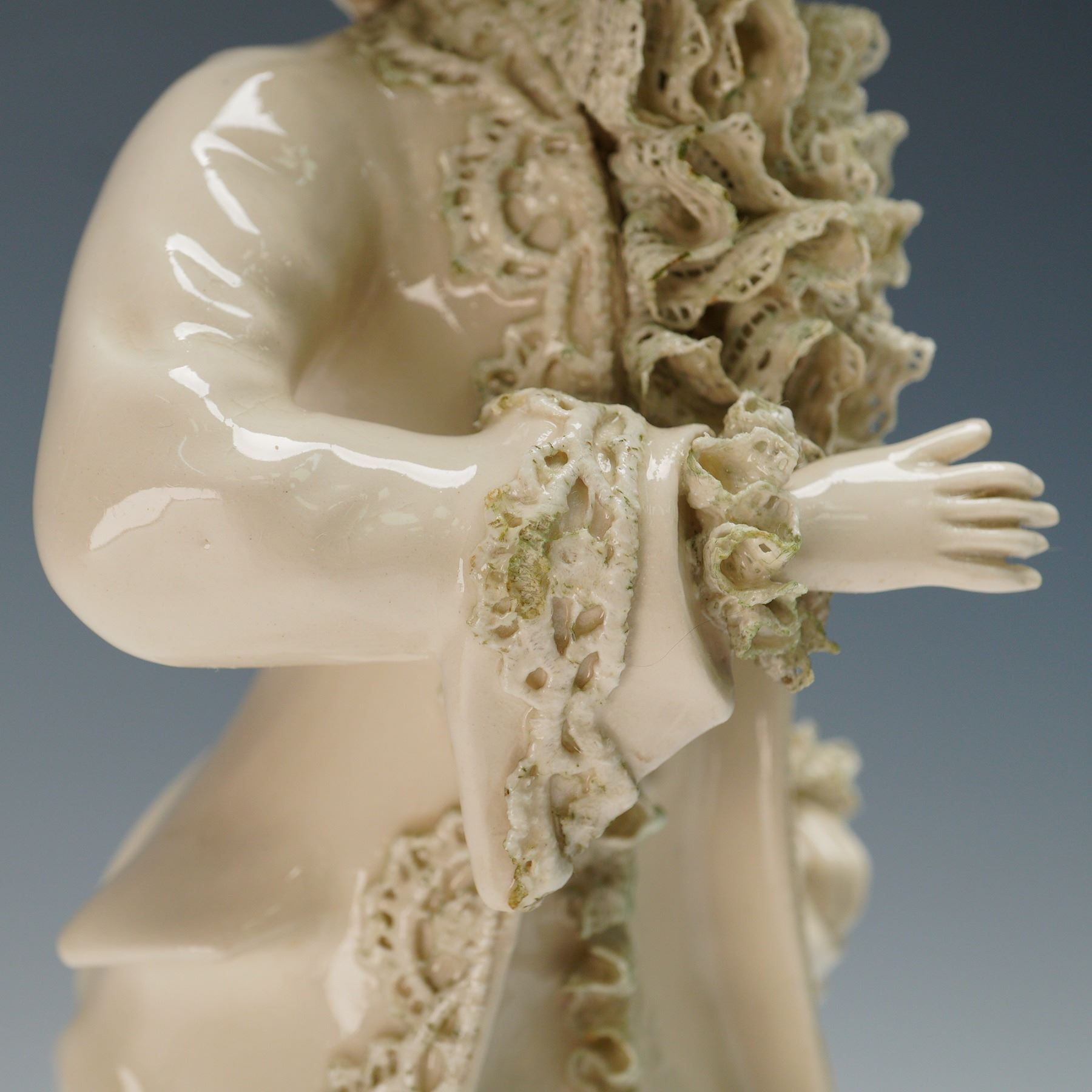 This finely crafted porcelain figurine depicts a gentleman in 18th-century attire, adorned with an elaborate feathered hat, ruffled cravat, and lace-trimmed coat. The piece is characterized by Cordeys signature applied lace detailing, visible throughout the cuffs, collar, and coat edges, as well as intricate floral and bow accents at the base. The underside is impressed with the Cordey mark and model number.
