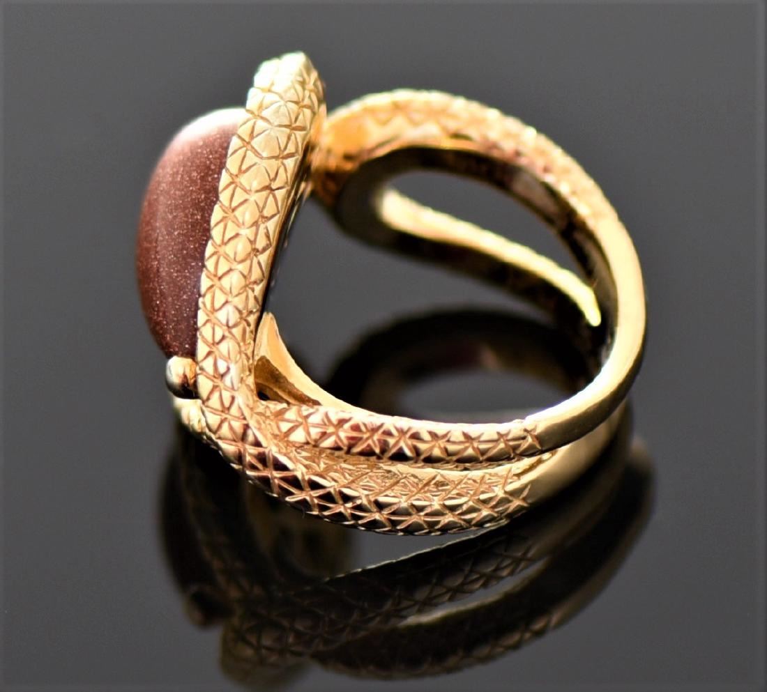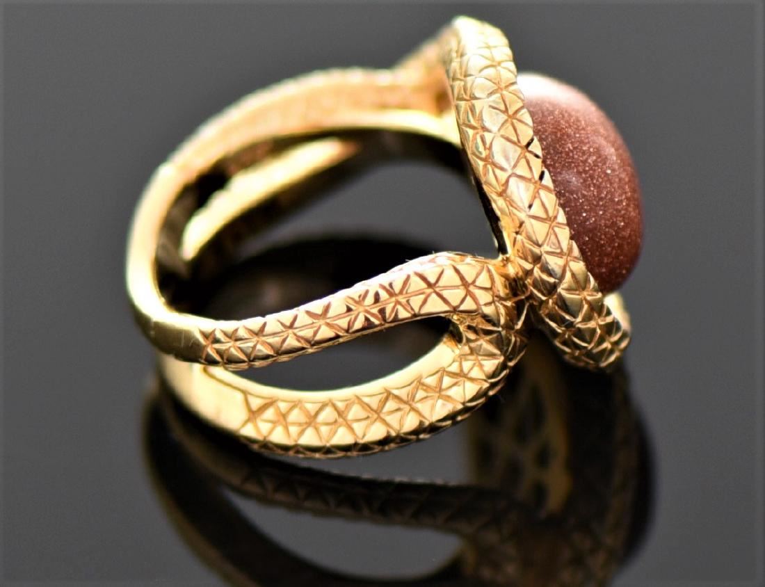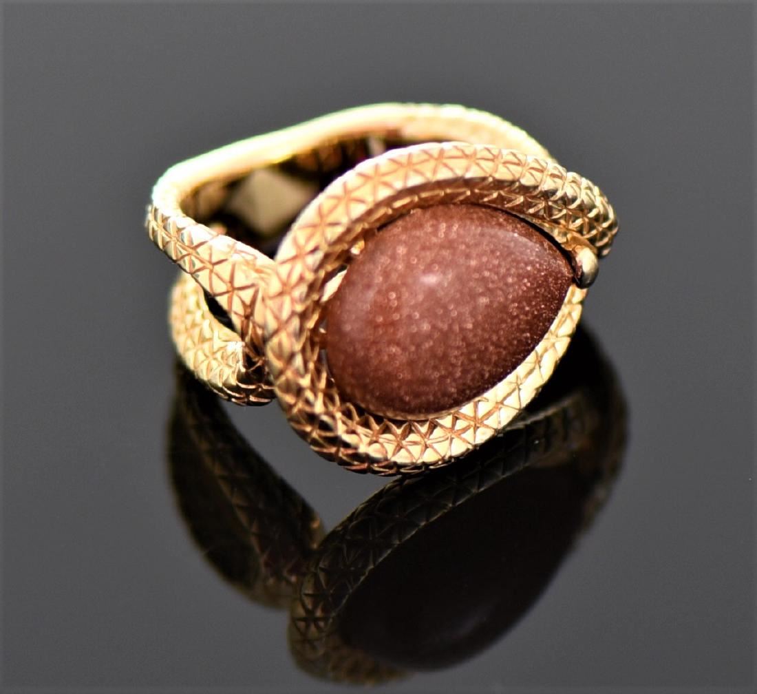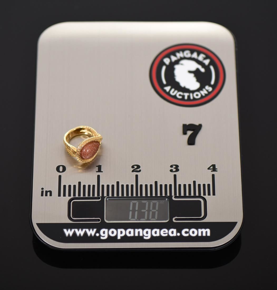 Cordova Snake Ring, Brown Goldstone With Gold Over Sterling Silver Ring. Ring Size 7. Estimated less than 50 yrs old. 925 Sterling Silver consisting of 92.5% silver and 7.5% copper. Tested Positive using Nitric Acid Chemical Scratch Test, Cloth Rub Test, Smell Test, and Magnet Test. No Markings. The reason silver needs to be combined with other metals is that it is very difficult to make great designs with just pure silver, which is very soft and malleable. A bit of hardness has to be introduced by adding other metals such as copper. That is why jewelers are capable of making the most intricate an complex designs with 925 Sterling Silver. Silver is one of the most valuable elements next to gold. Mexico is the leading producer of sliver, followed by the United States, Canada, Australia, Spain, Peru, and Russia. Many countries do not require their precious metal items to be stamped and therefore we test to ensure we accurately represent the product. Size and/or Weight: See Measurement Photo. (Photos Represent The Lot Condition.)