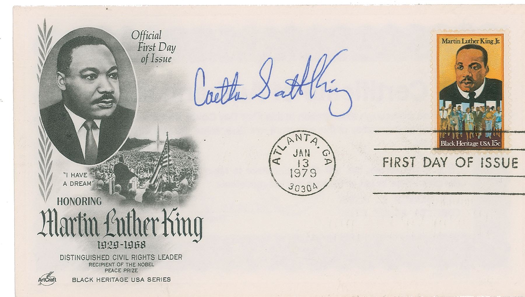 FDC with a cachet honoring Dr. Martin Luther King, Jr., signed in blue ballpoint by his wife, "Coretta Scott King." In very fine condition.