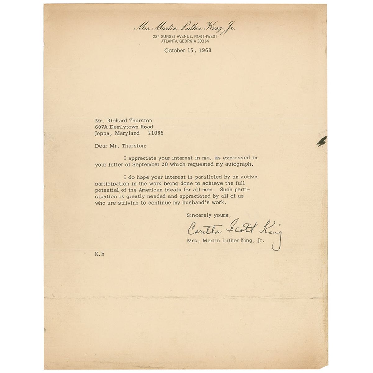 TLS, one page, 8.5 x 11, Mrs. Martin Luther King, Jr. letterhead, October 15, 1968. Letter to an admirer. In full: “I appreciate your interest in me, as expressed in your letter of September 20 which requested my autograph. I do hope your interest is paralleled by an active participation in the work being done to achieve the full potential of the American ideals for all men. Such participation is greatly needed and appreciated by all of us who are striving to continue my husband’s work.” Horizontal folds, some scattered soiling, small ink mark and surface loss to right edge, and uniform toning, otherwise fine condition.