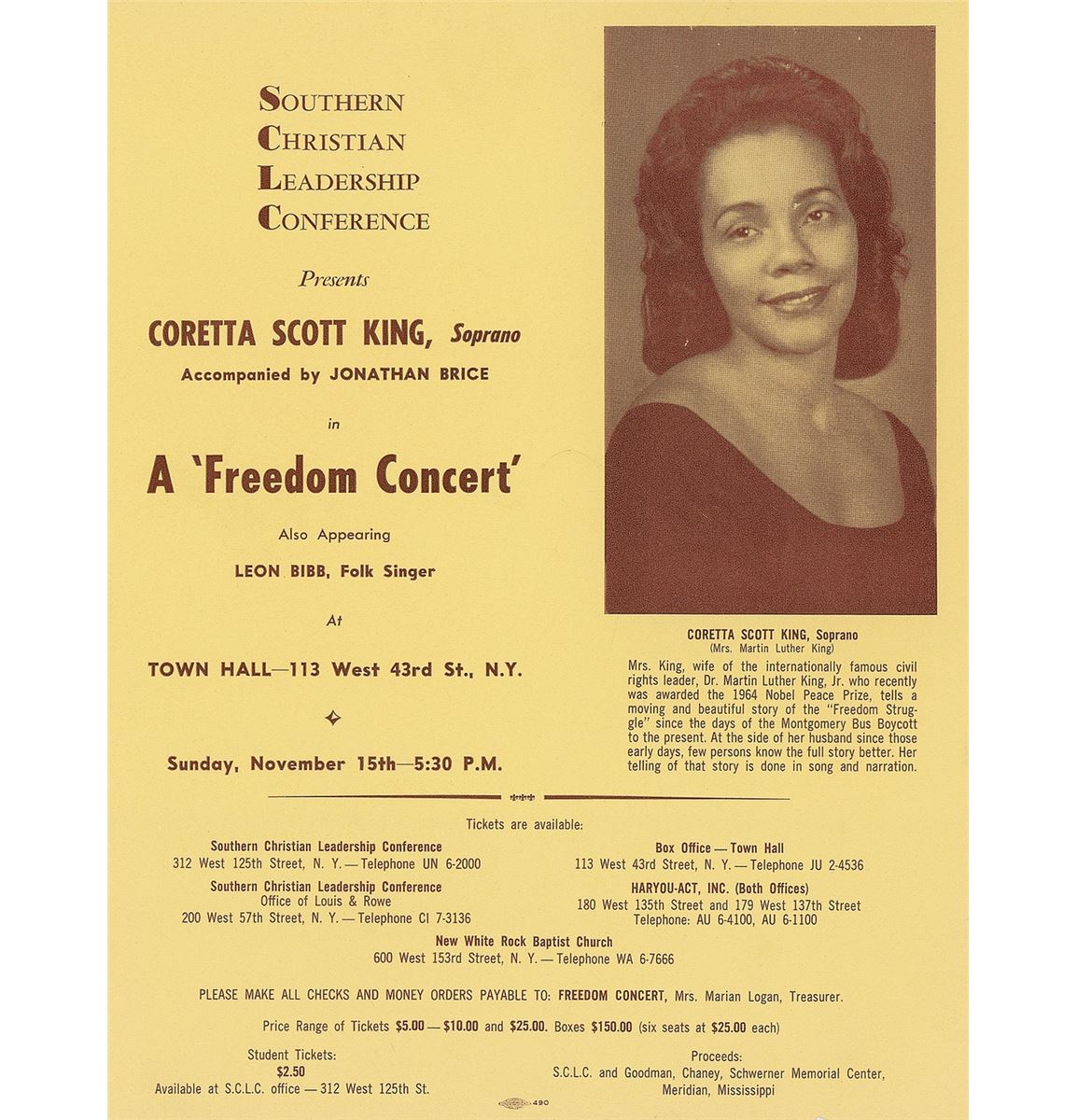 Two items: a program for the ‘Freedom Concert’ held at the Town Hall in New York on November 15, 1964, four pages, 6.75 x 10, featuring Coretta Scott King as the ‘Soprano-Narrator’; and a flyer advertising the event, one page, 8.5 x 11, featuring a large image of King, a brief description, and ticket information. In overall fine condition, with mild scattered creases and one tiny stain to the program. From the collection of Warren Arthur ‘Chip’ Logan.