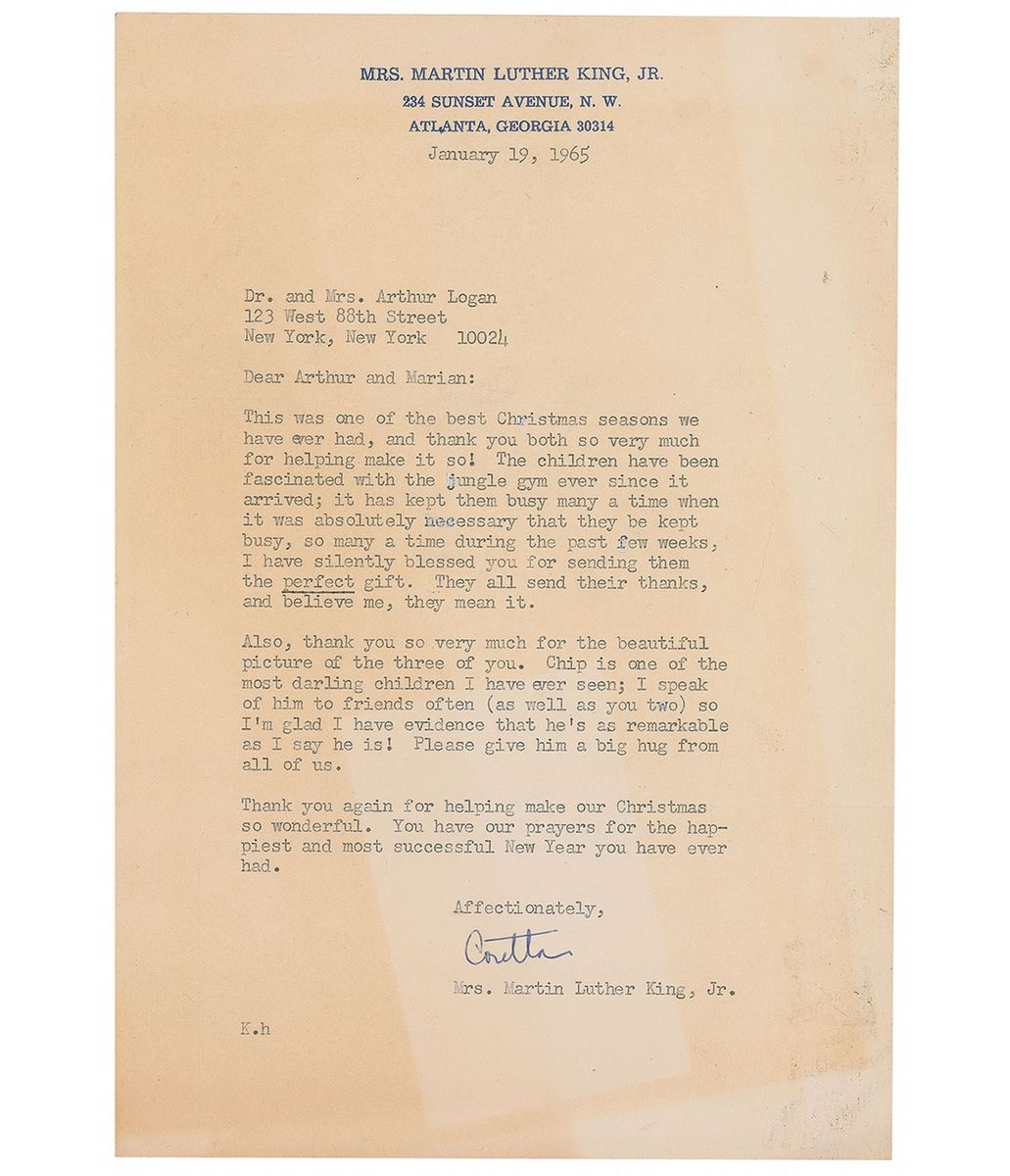 TLS signed “Coretta,” one page, 6.5 x 9.25, personal letterhead, January 19, 1965. Letter to Arthur and Marian Logan, in part: “This was one of the best Christmas seasons we have ever had, and thank you both so very much for helping make it so! The children have been fascinated with the jungle gym ever since it arrived; it has kept them busy many a time when it was absolutely necessary that they be kept busy…Also, thank you so very much for the beautiful picture of the three of you. Chip is one of the most darling children I have ever seen; I speak of him to friends often (as well as you two) so I’m glad I have evidence that he’s as remarkable as I say he is! Please give him a big hug from all of us.” Some creasing and soiling to upper and lower right corners, an evenly trimmed bottom edge, and an irregular box of toning, otherwise fine condition. From the collection of Warren Arthur ‘Chip’ Logan.