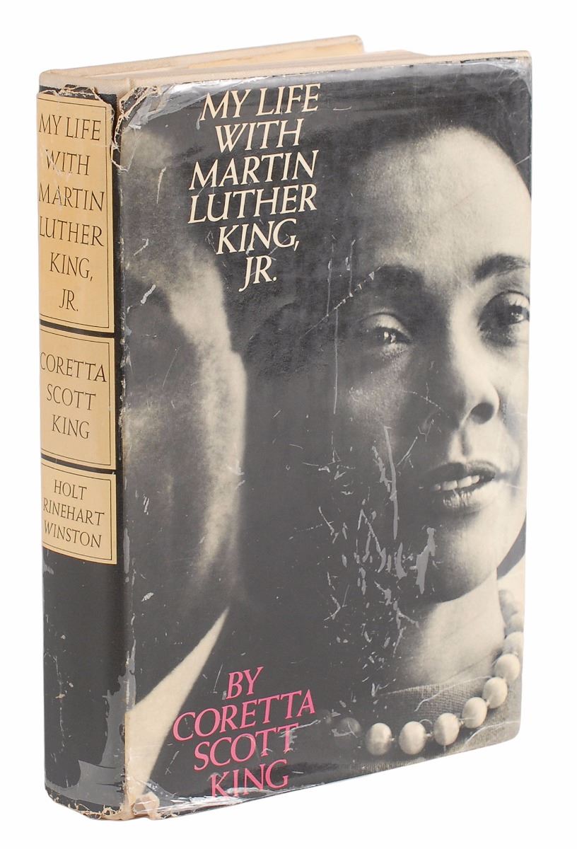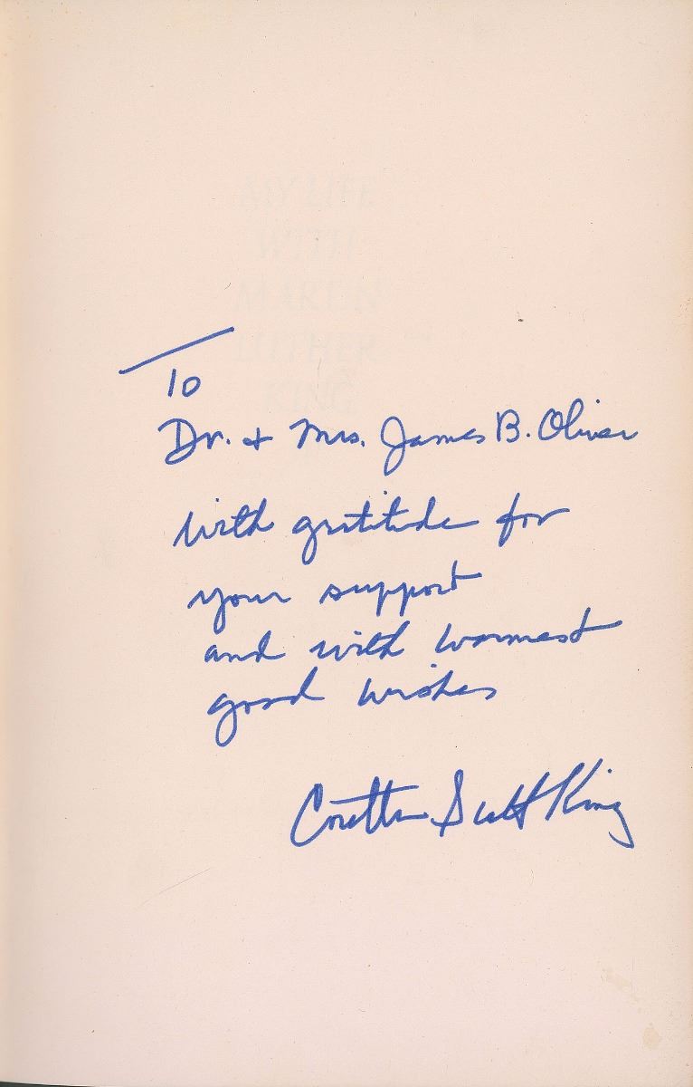 Signed book: My Life with Martin Luther King, Jr. First edition. NY: Holt, Rinehart and Winston, 1969. Hardcover with dust jacket, 6.25 x 9.25, 372 pages. Signed and inscribed on a free end page in blue felt tip, “To Dr. & Mrs. James B. Oliver, with gratitude for your support and with warmest good wishes, Coretta Scott King.” In very good condition, with slight creasing, surface impressions, and edge tears to dust jacket, some areas of discoloration to book covers and textblock edges, and trivial soiling to signed page.