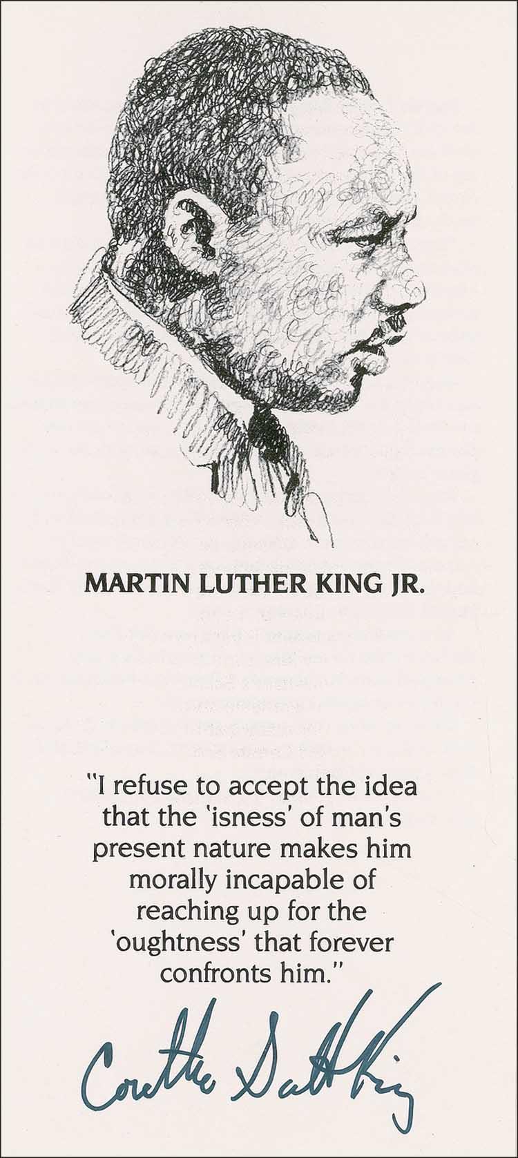 Martin Luther King informational slip, 3.5 x 8, bearing an image of the civil rights leader at the top, signed at the bottom in black felt tip by Coretta Scott King. In very fine condition. RRAuction COA.