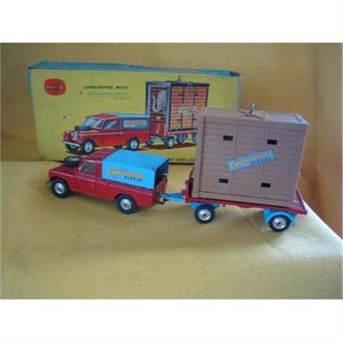 This die cast toy, #19 Chipperfields Land Rover with Elephant Cage on Trailer in it's original box was made by Corgi Toys in 1967. <BR>Corgi started life as a division of Mettoy, a company founded in 1933 by Philipp Ullmann. Mettoy, short for metal toys, set up a factory in Swansea, South Wales, in 1944. From 1950 onwards Mettoy released some die-cast vehicles but it wasn't until late 1955 that the Corgi brand was born. The Corgi name was probably chosen as it's the Queens favorite breed of dog and their Welsh origins. Having now started in the vehicle die-cast market, Mettoy had to compete with a rival brand - Dinky Toys. Corgi needed a gimmick to get a foothold into the market and so decided to use the latest technology - plastic! Using plastic for the windows was a revelation, but Corgi didn't stop there as they also introduced opening doors, boots and bonnets, suspension and jewelled headlights! Corgi were not afraid to take risks and started up the Corgi Model Club and even advertised on TV as early as 1957.