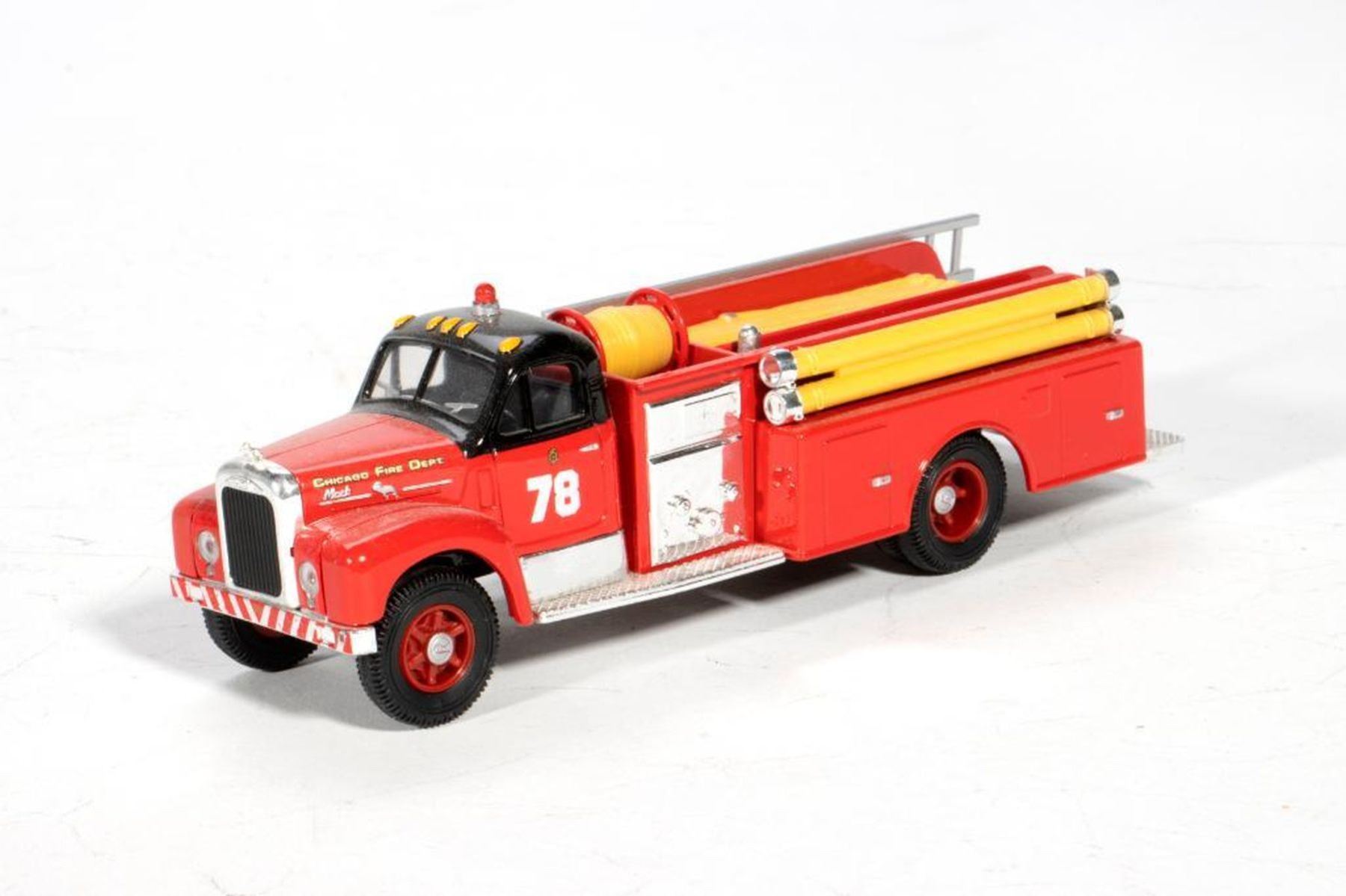 Greyhound Scenicruiser no box; American La France Fire Engine with box; Mack B Series Chicago Pumper with box; Lionel Classics Bus with box; MCI-102DL3 Demo Bus Bank Version; Mack B Series Aerial Ladder Truck