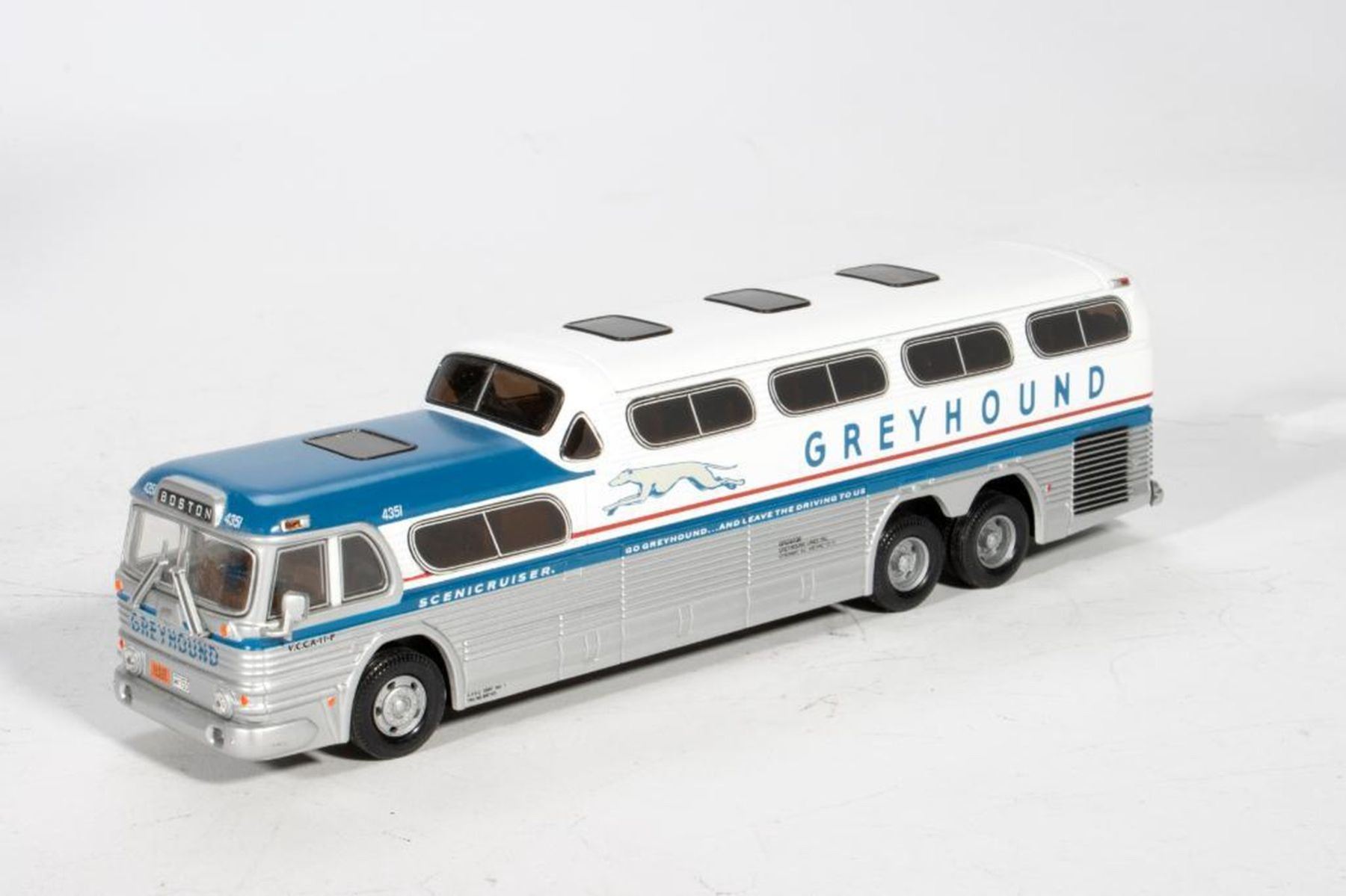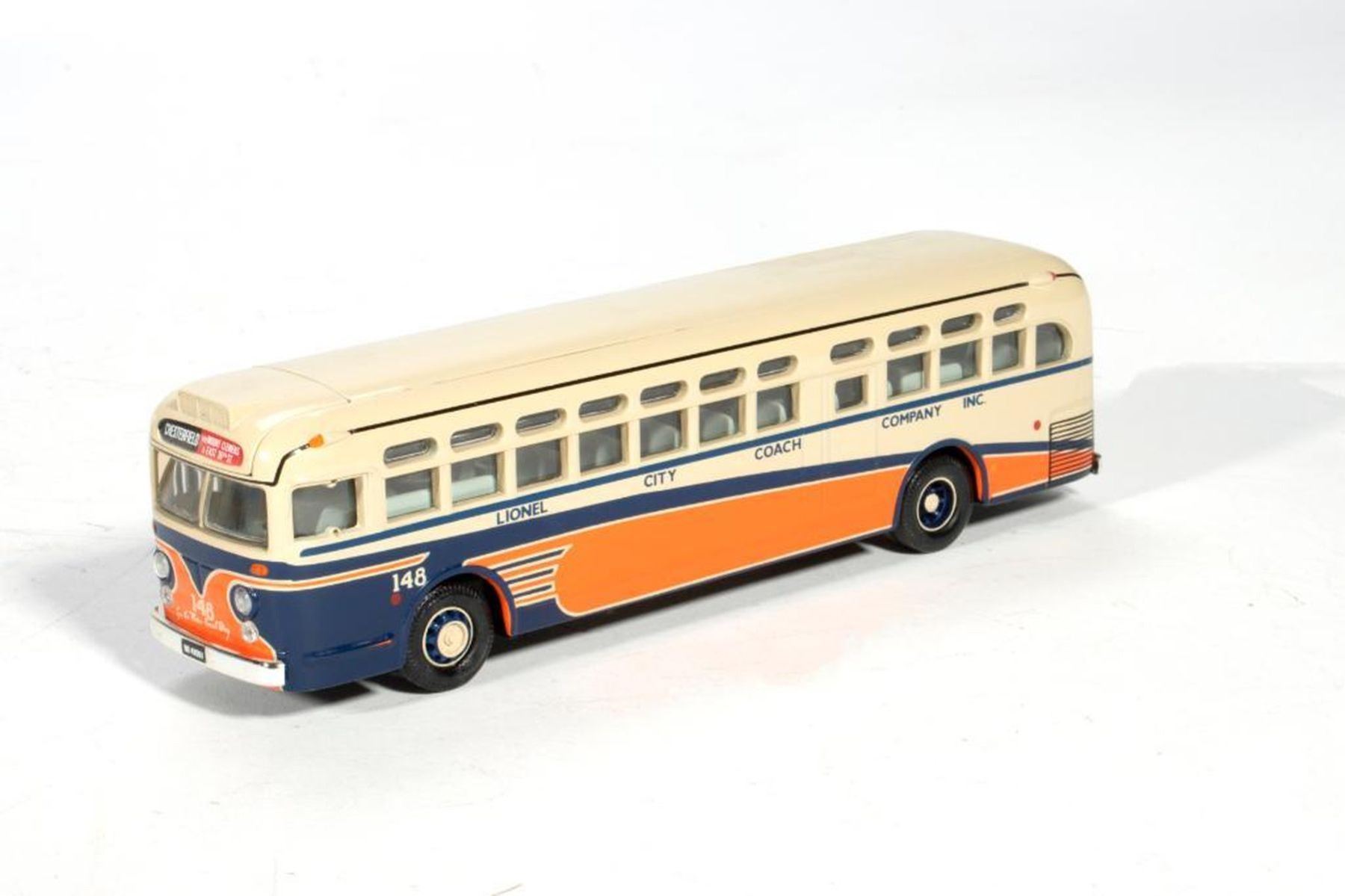 Greyhound Scenicruiser no box; American La France Fire Engine with box; Mack B Series Chicago Pumper with box; Lionel Classics Bus with box; MCI-102DL3 Demo Bus Bank Version; Mack B Series Aerial Ladder Truck