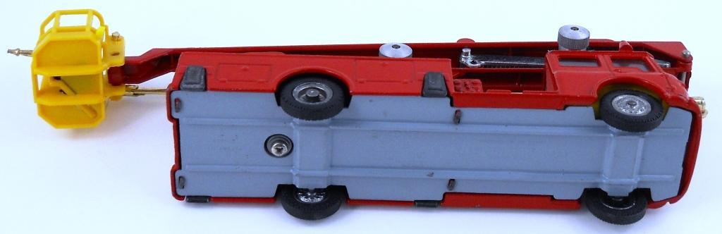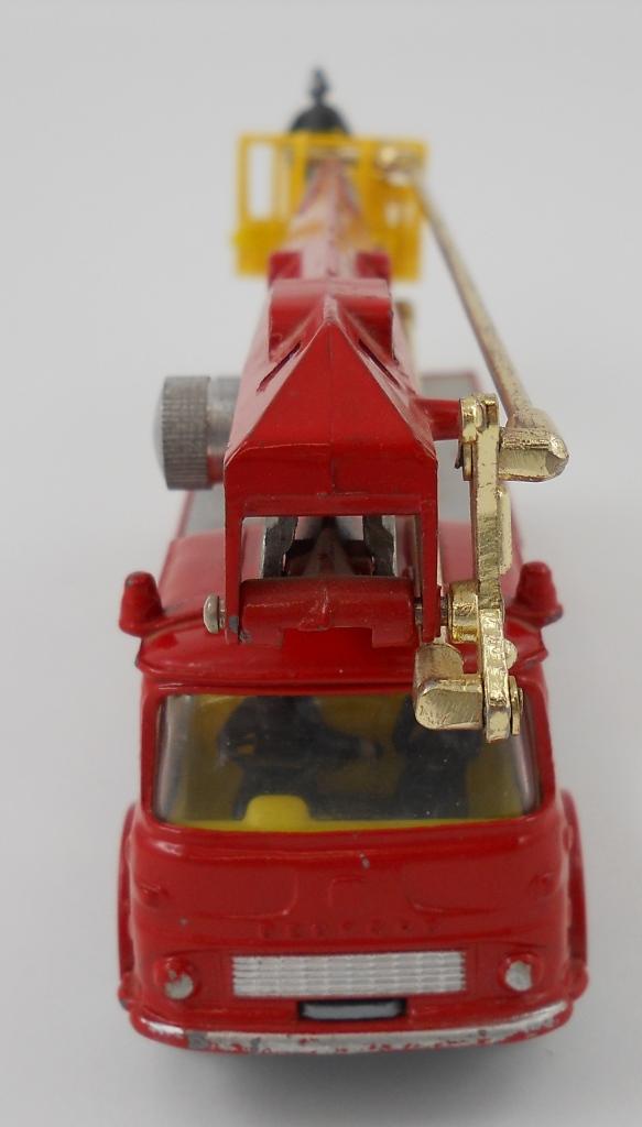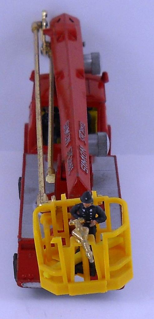 This is a Simon Snorkel Fire Engine, made by Corgi. The truck itself is 6-3/4 inches long; from the front of the truck to the end of the snorkel is about 9 inches long. There are five firemen in the cab and one that operates the hose on the snorkel. Side stabilizers pull out to secure the truck when the snorkel is extended. The snorkel is in good working condition, with two knobs that raise and lower each section. The metal underside of truck is embossed with: "Corgi Major Toys - Made in Gt Britain - Snorkel Fire Truck - Patent No 904525."